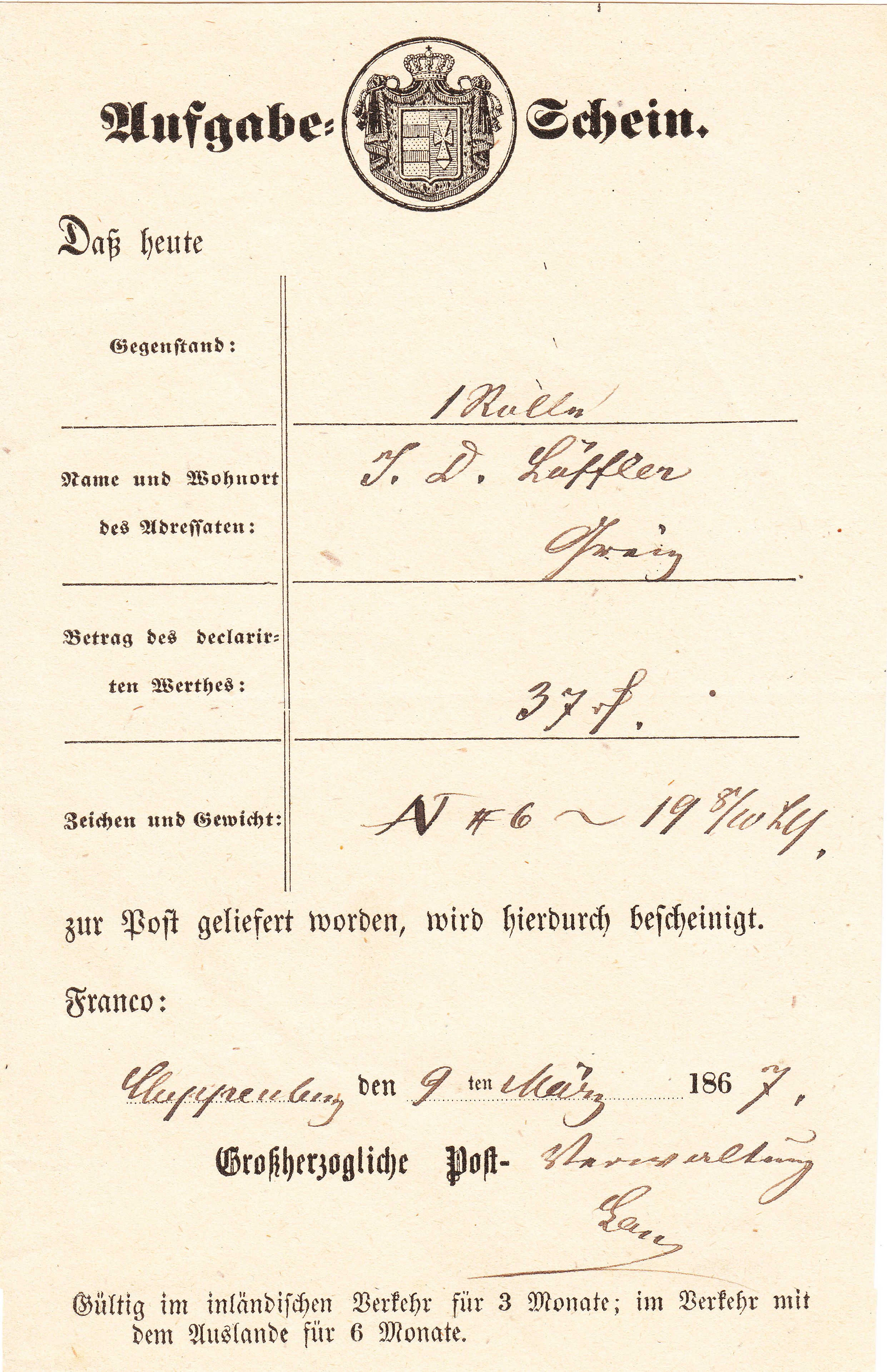 Hier ein Vordruck "Aufgabe=Schein", verwendet am 09.03.1867 in Cloppenburg: