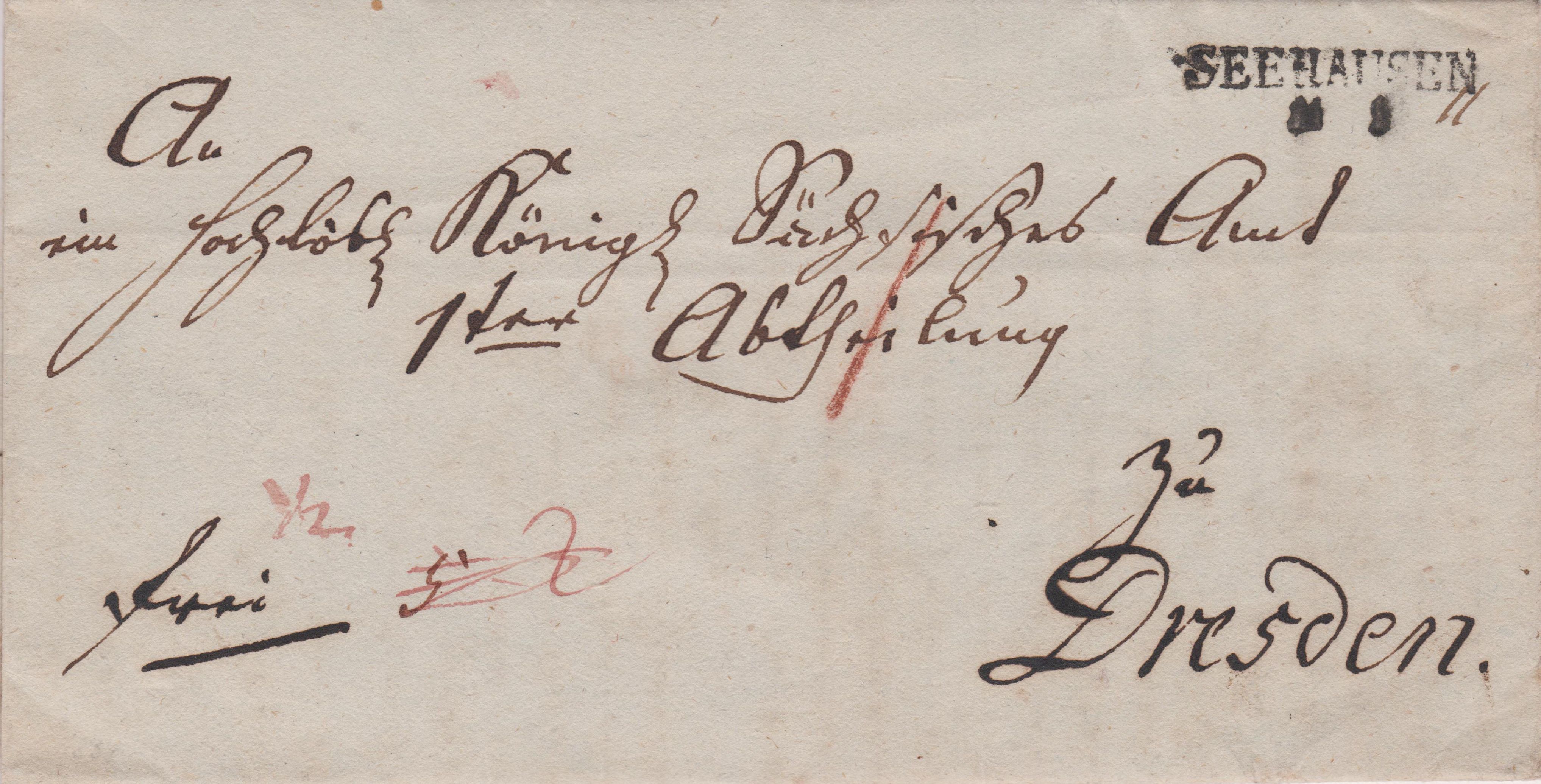 Hier ein "An ein Hochlöbl. Königl. Sächsisches Amt 1ter Abtheilung zu Dresden" adressierter Francobrief, aufgegeben am 11.01.1834 mit zweizeiligem Langstempel "SEEHAUSEN 11 1":