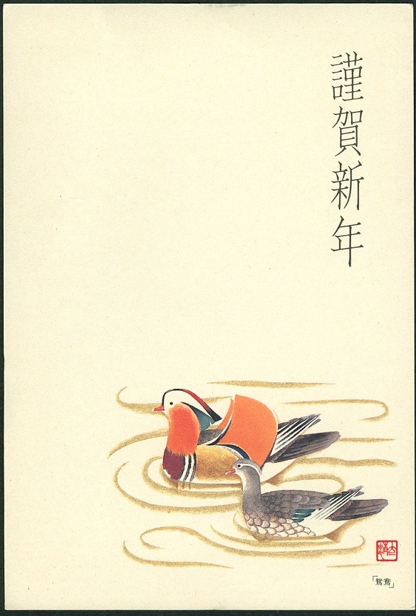 Die Rückseite mit der Illustration eines Mandarin-Entenpaares. Sehr dekorativ.