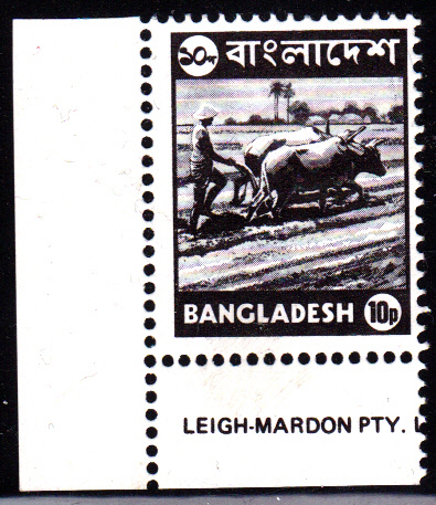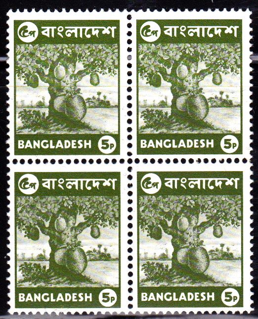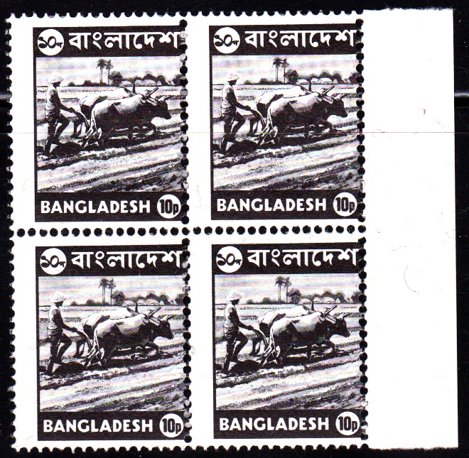 Zunächst hier die am 11.Februar erschienene Marke zu 5 Paisa (MiNr 59) zweimal im Viererblock, davon einmal Markenbild stark dezentriert (nach links verschoben) und zwei Werte mit Ersttagsstempel Dacca. Wie man sieht, gibt es auch hier Farbunterschiede.
