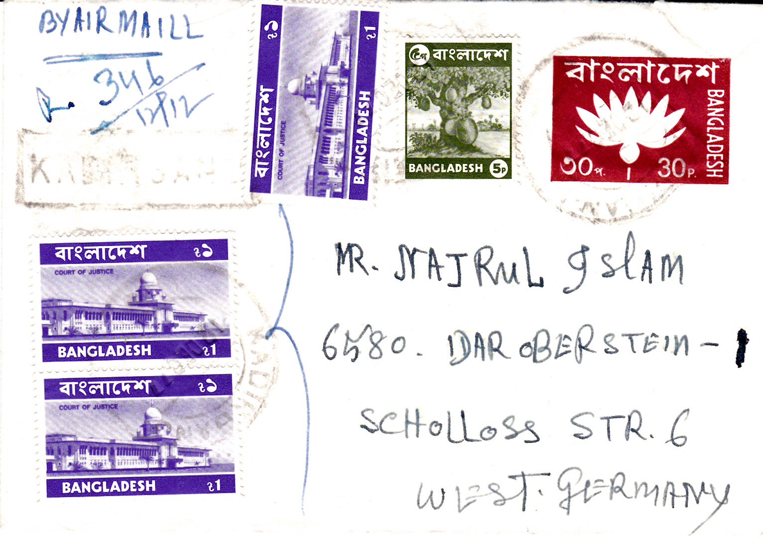 Dieser Inlandsumschlag wurde am 12.12.1977 mit Luftpost und per Einschreiben nach Idar-Oberstein verschickt. Die Zusatzfrankatur betrug 4 Taka und 5 Paisa, davon eine Marke zu 1 Taka auf der Rückseite verklebt.