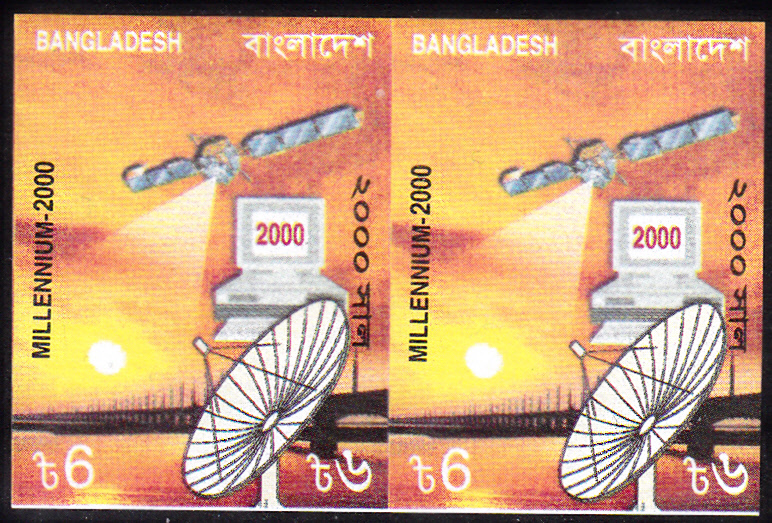 Zu der Ausgabe "Eintritt in das Jahr 2000" gehört noch eine zweite Marke (MiNr 715), die einen Satelliten, einen Computer, eine Satellitenempfangsstation und eine Brücke zeigt.