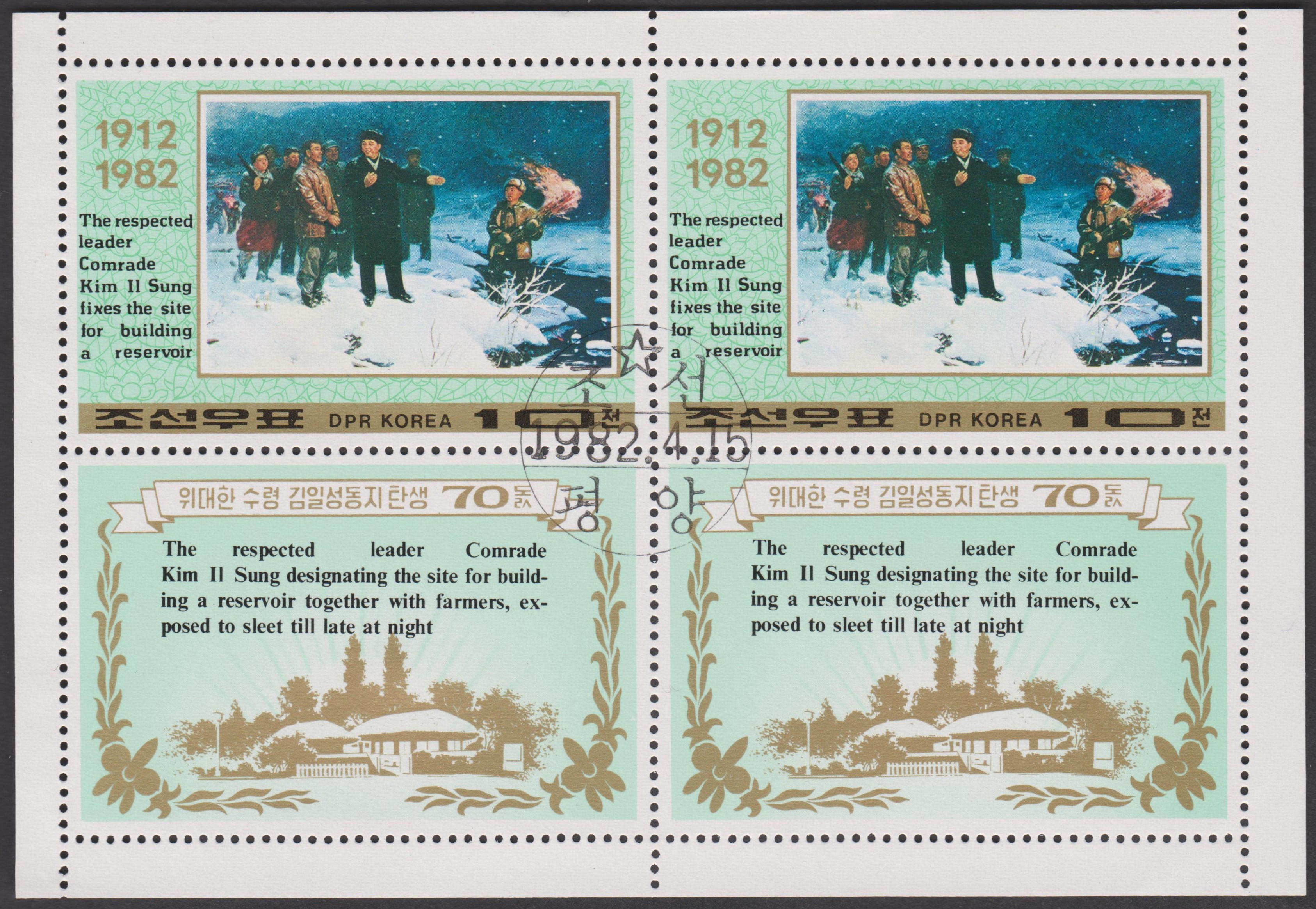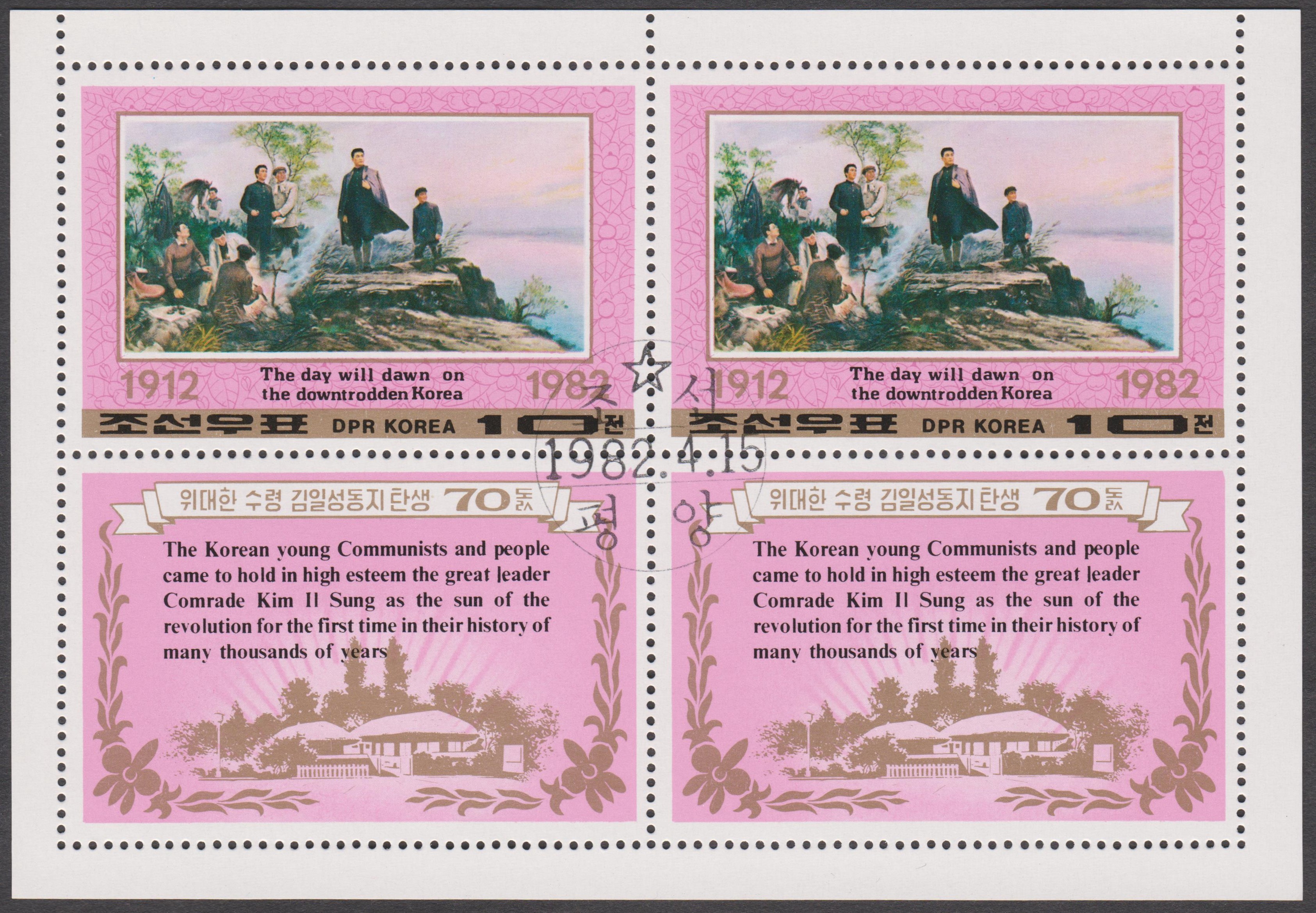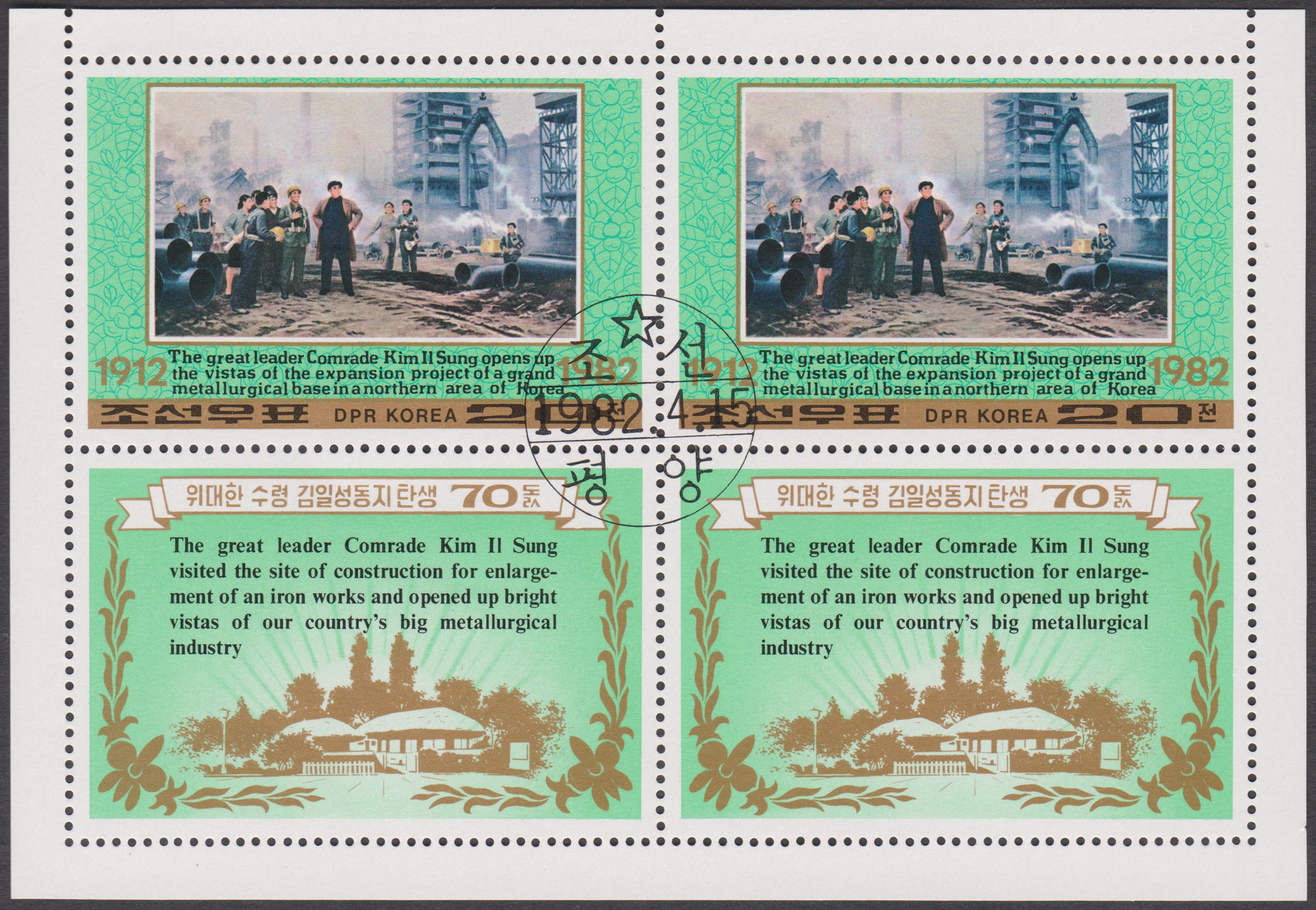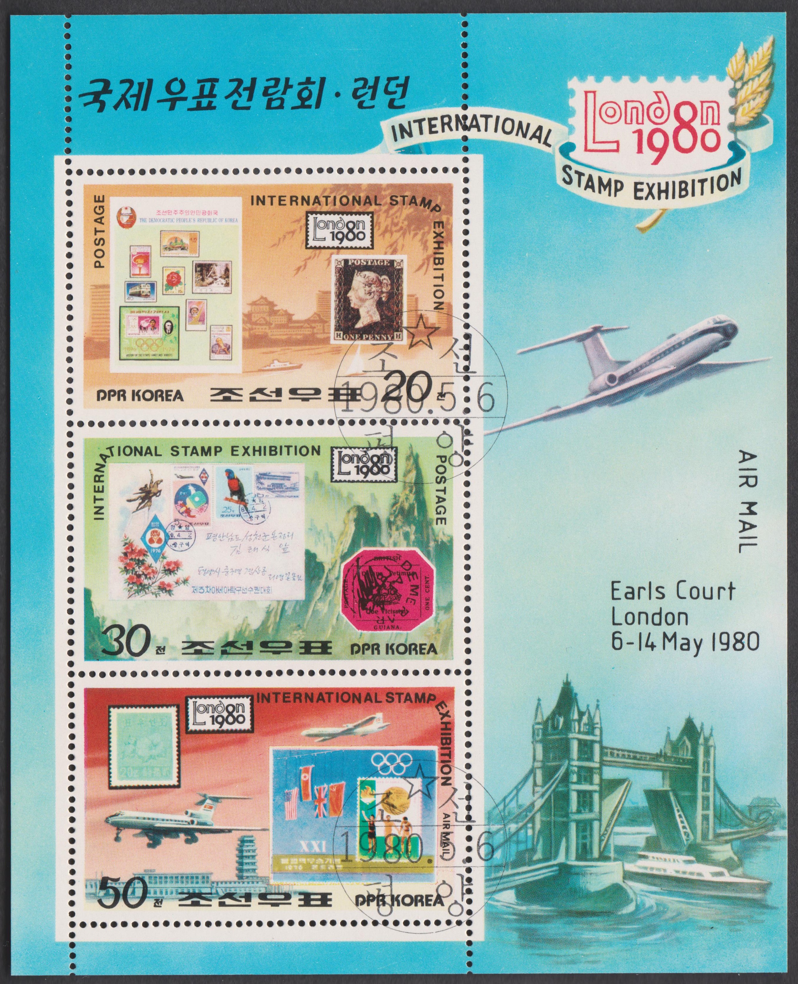 Nordkorea Block 73 A mit MiNr. 1996, A 1996 und B 1996 erschien am 06.05.1980 zum Thema Internationale Briefmarkenausstellung London 1980 und zeigt als Motive Großbritannien MiNr. 1, British Guiana MiNr. 9 sowie Nordkorea MiNr. 1: