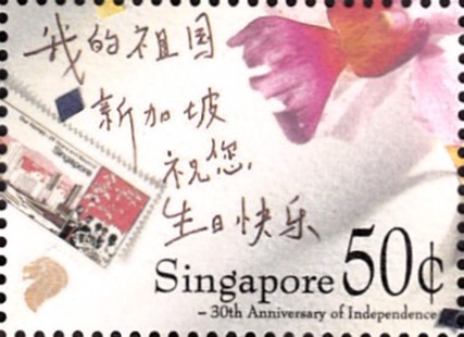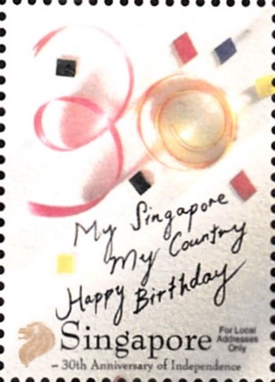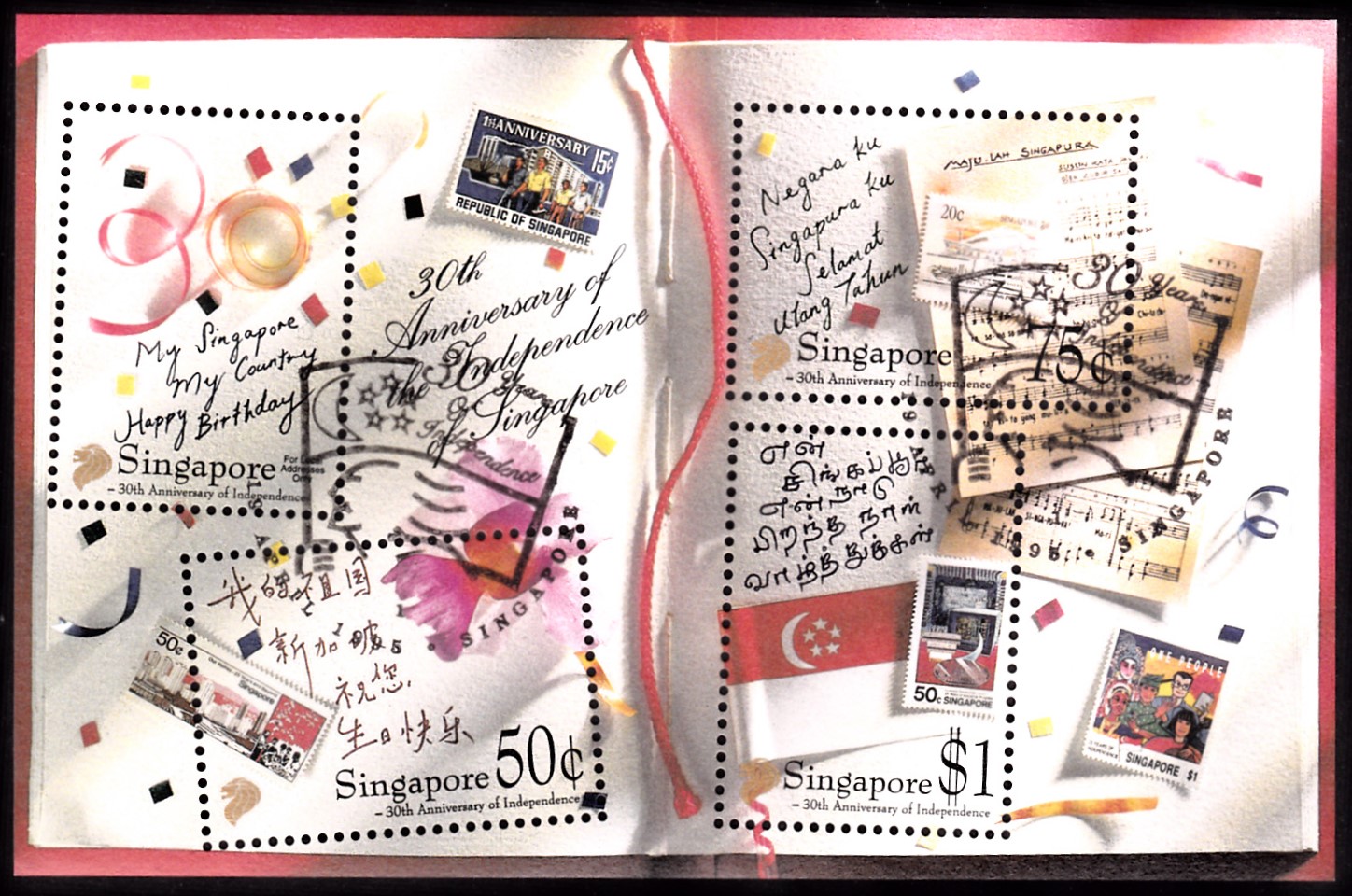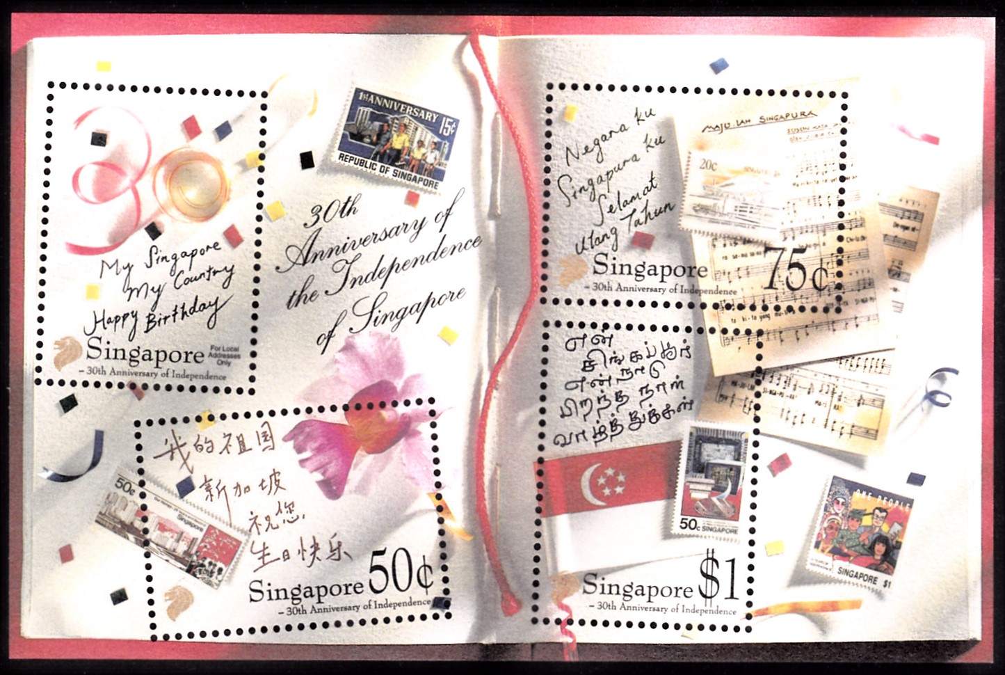 Zum Thema "30 Jahre Unabhängigkeit" erschien in Singapur eine Markenausgabe bestehend aus vier Marken und einem Block.