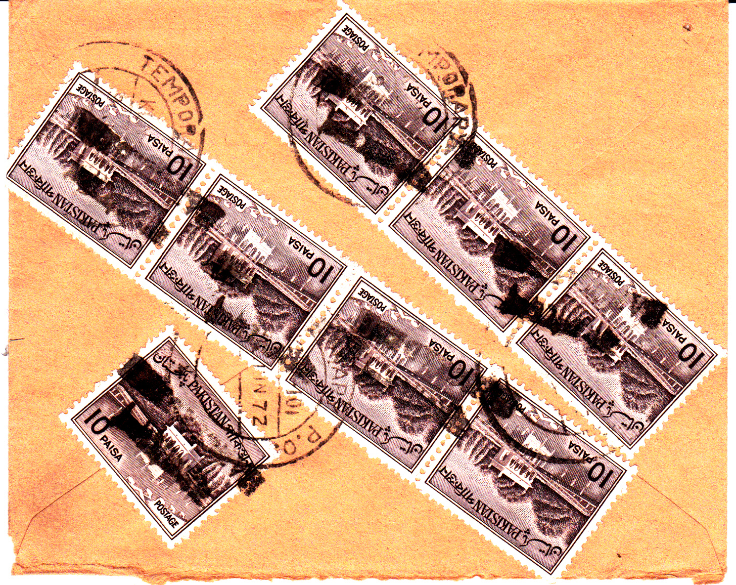Die Handstempelaufdrucke sind nicht nur auf Marken angebracht worden, auch auf Ganzsachen wie Postkarten, Umschlägen und Aerogrammen kommen sie vor. Hier ein Pakistan-Ganzsachenumschlag mit einem Handstempel des Typs D nur in Englisch und nur mit großen Buchstaben.