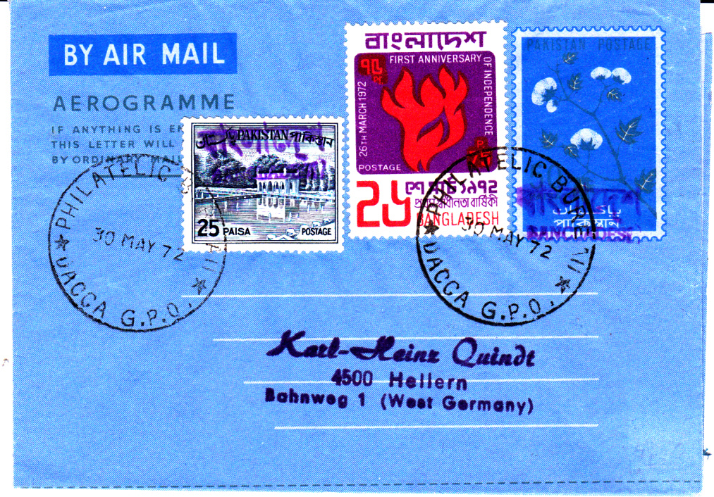 Nun komme ich zu den Aerogrammen. Hier ein Pakistan Aerogramm mit Handstempelaufdruck vom Typ A (Bengali und Englisch nur Großbuchstaben) mit zusätzlicher Frankatur einer regulären Bangladesch Marke und einer Pakistanmarke mit dem gleichen Handstempel. Der Brief wurde von Philatelic Bureau beim Postamt Dacca G.P.O (der Versandstelle für Sammler) nach Deutschland versandt.