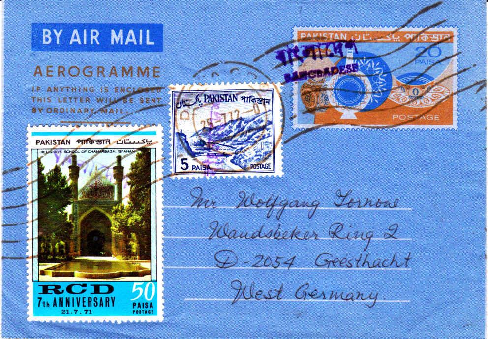 Dieser Pakistan Luftpostumschlag stammt noch aus den 50er Jahren des vorigen Jahrhunderts aus der Zeit als die Rupie noch in 16 Annas unterteilt war und 1 Anna in 12 Pies. Der Wertstempel des Umschlages wurde mit einem Handstempel vom Typ D (nur Englisch nur Großbuchstaben) überstempelt, während die beiden Marken, davon auch eine uralt Marke aus Pakistan zu 3 Annas, und die 20 Paisa Sondermarke Hockey einen Handstempel vom Typ E (Englisch nur Anfangsbuchstabe groß) aufweisen.