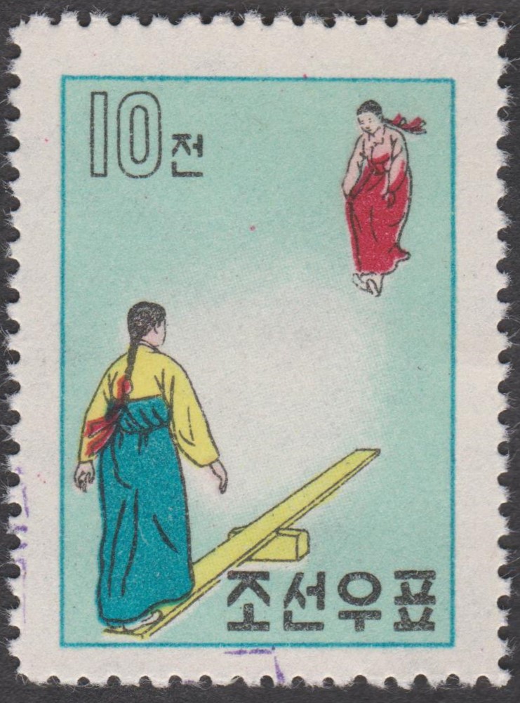 Nordkorea MiNr. 267 bis 270 erschienen am 15.12.1960 zum Thema "Nationalsport" und zeigen die Sportarten Ringen, Schaukeln, Bogenschießen sowie Wippen: