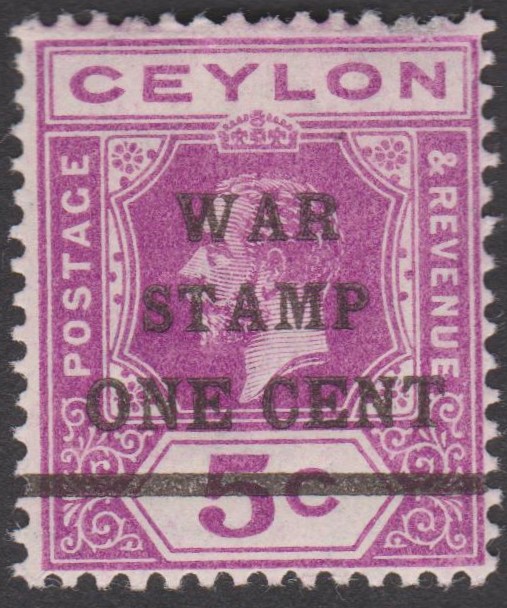 Am 17.11.1918 erschien diese "Kriegssteuermarke", Ceylon MiNr. 181, indem die Freimarke König Georg V., MiNr. 168, mit dem Aufdruck "ONE CENT", Ceylon MiNr. 180, mit einem weiteren Aufdruck "WAR STAMP" versehen wurde: