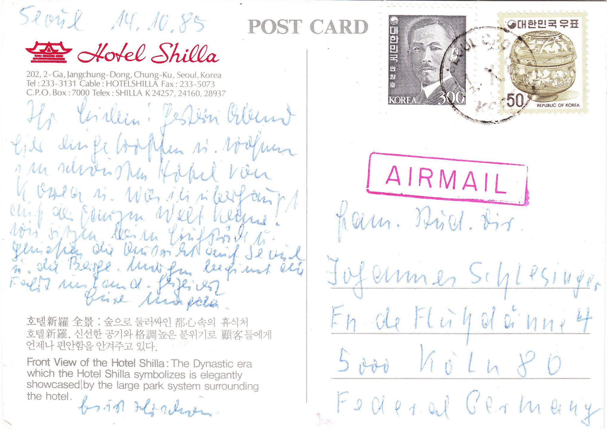 Diese Ansichtskarte vom 14.10.1985 trägt zwei Postwertzeichen aus Südkorea: