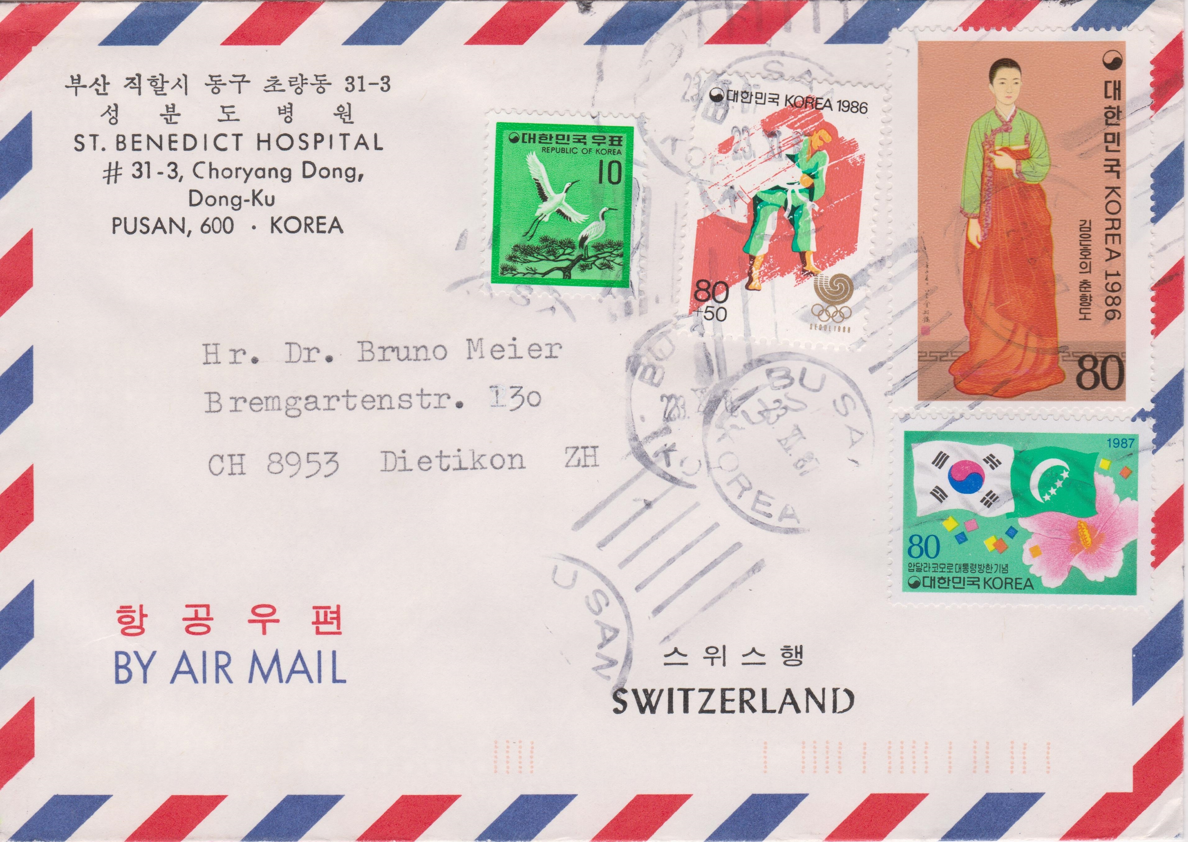 Dieser Luftpostbrief in die Schweiz wurde per Mischfrankatur mit vier verschiedenen Postwertzeichen aus Südkorea freigemacht und am 23.11.1987 in BUSAN aufgegeben: