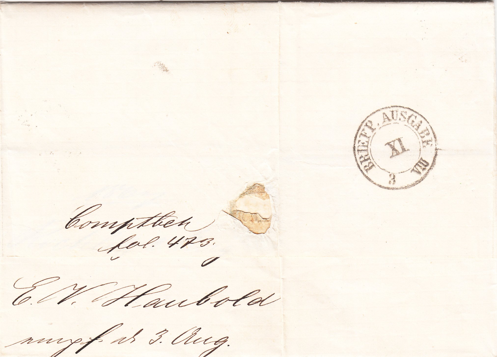 In Dresden wurde rückseitig ein Zweikreisstempel "BRIEFP. AUSGABE XI 3 VIII" abgeschlagen: