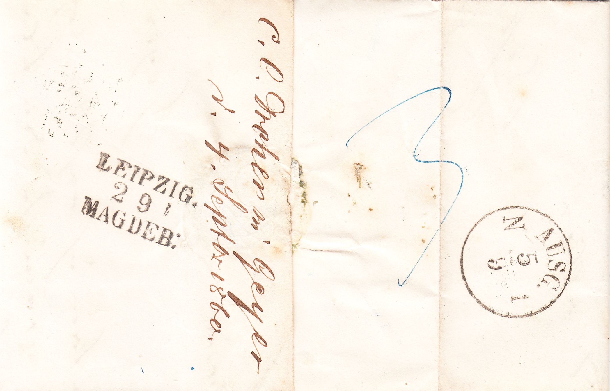 Dieser an "Herrn Ephraim Schulze" in "Oranienbaum" adressierte Brief wurde am 04.09.1860 in GEYER in Sachsen aufgegeben und kam laut rückseitigem Ausgabestempel am 05.09.1860 in Oranienbaum an: