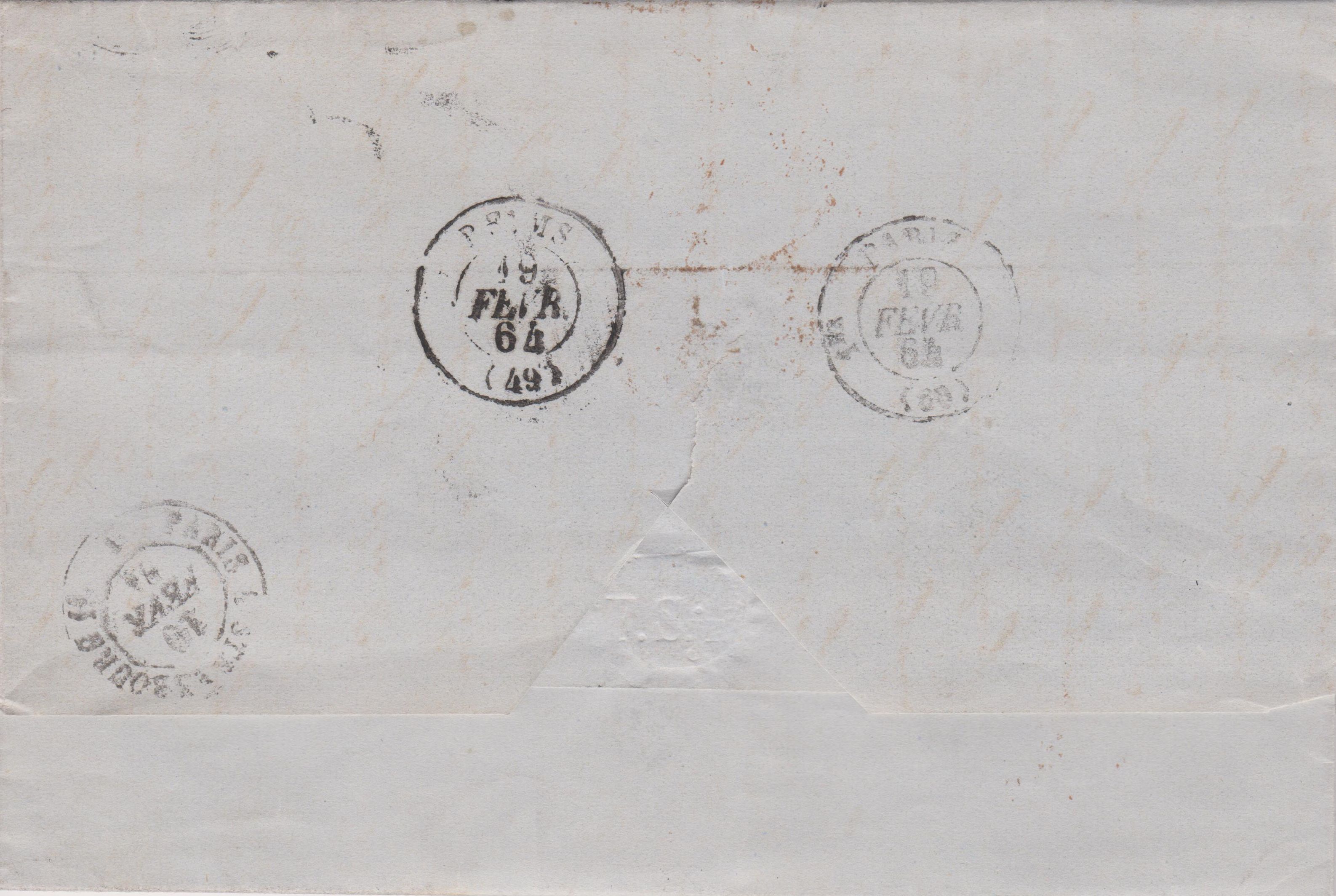 Dann lief der Beleg am 19.02.1864 zunächst nach "PARIS" und dann per Bahnpost "PARIS A STRASBOURG" nach "REIMS":