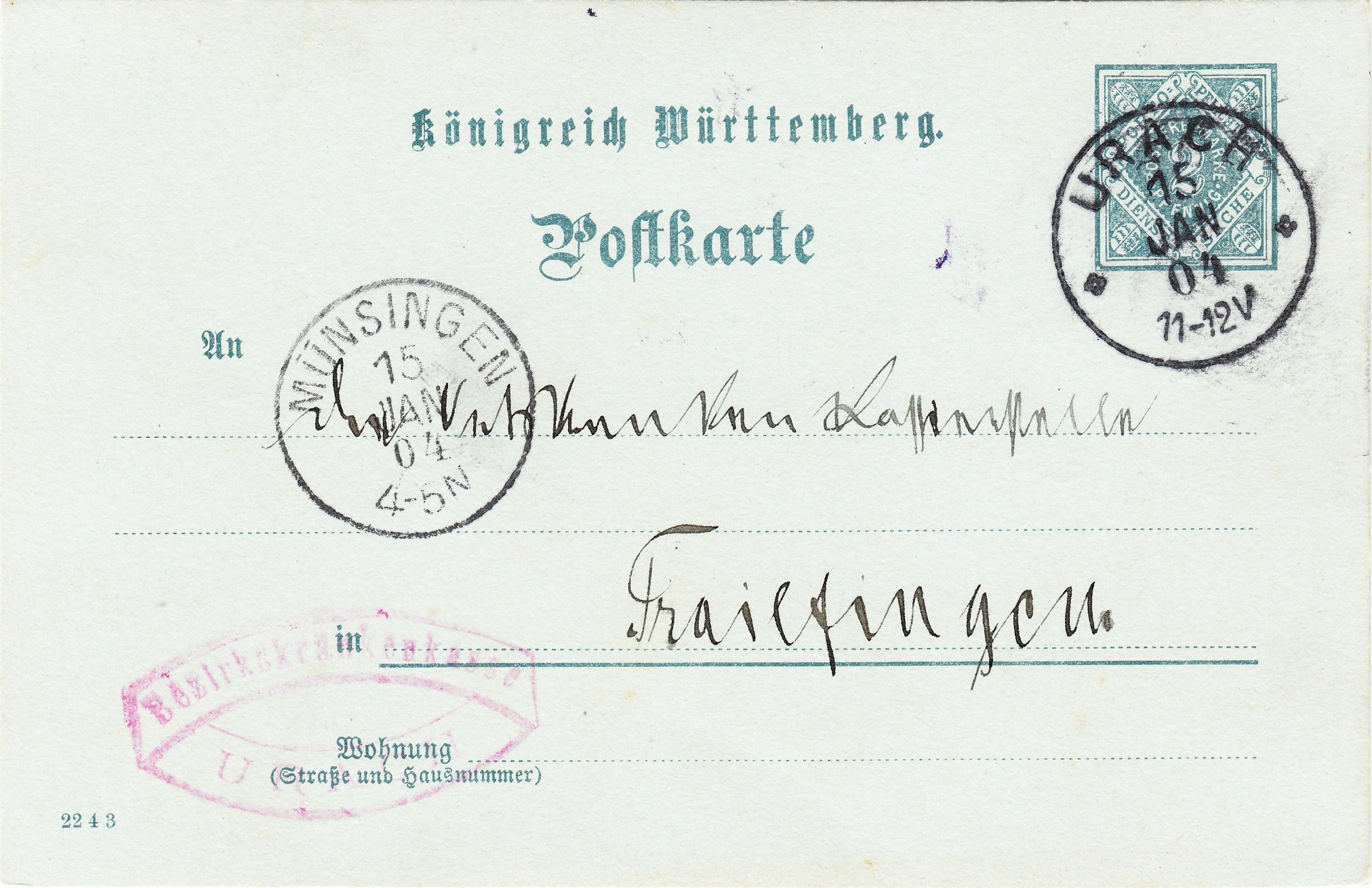 Dieses Exemplar wurde am 15.01.1904 in Urach im damaligen Oberamt Urach aufgegeben: