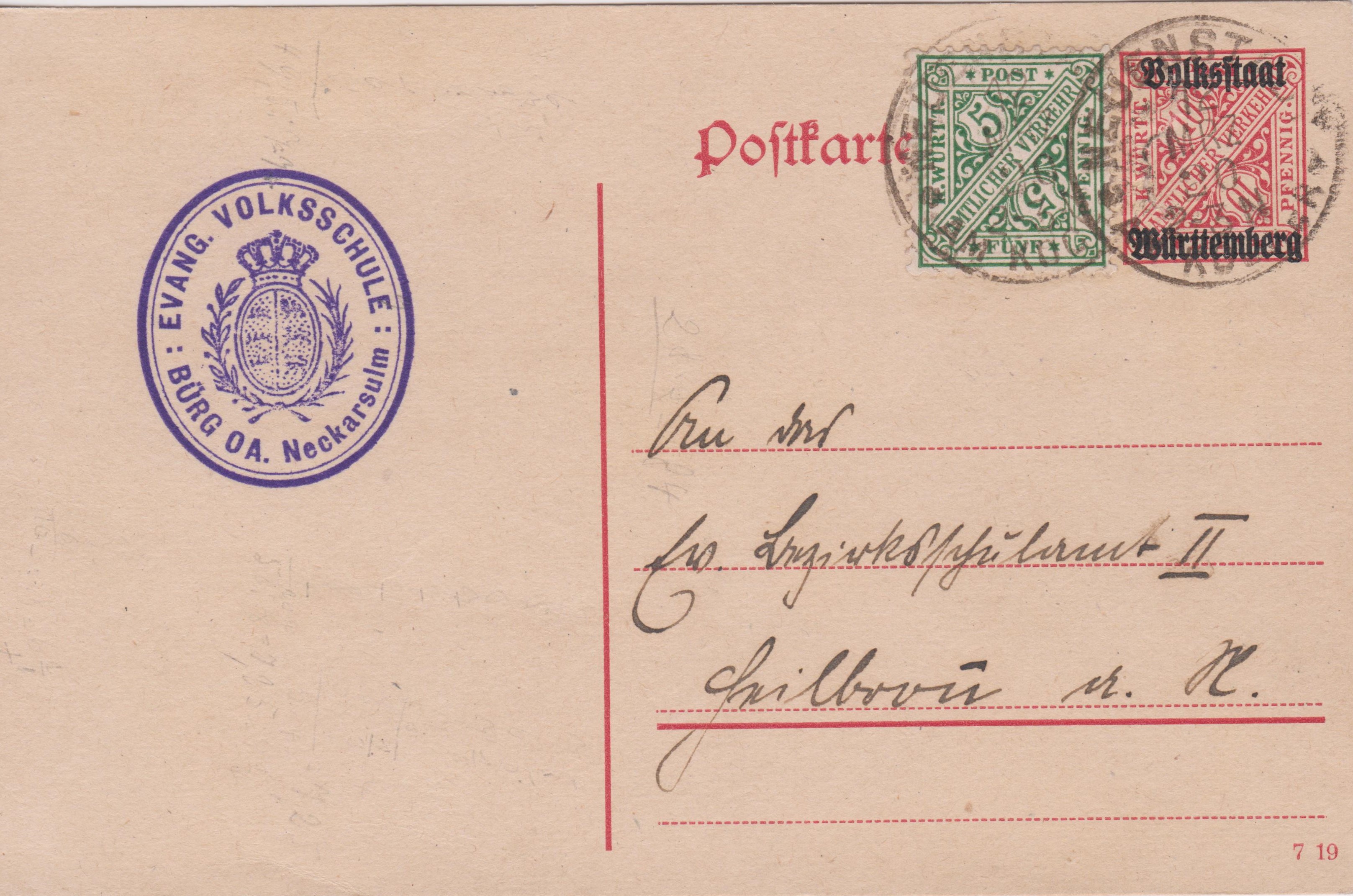 Ganzsache 10 Pf Volksstaat Württemberg mit Zusatzfrankatur von 5 Pf, aufgegeben am 12.03.1920: