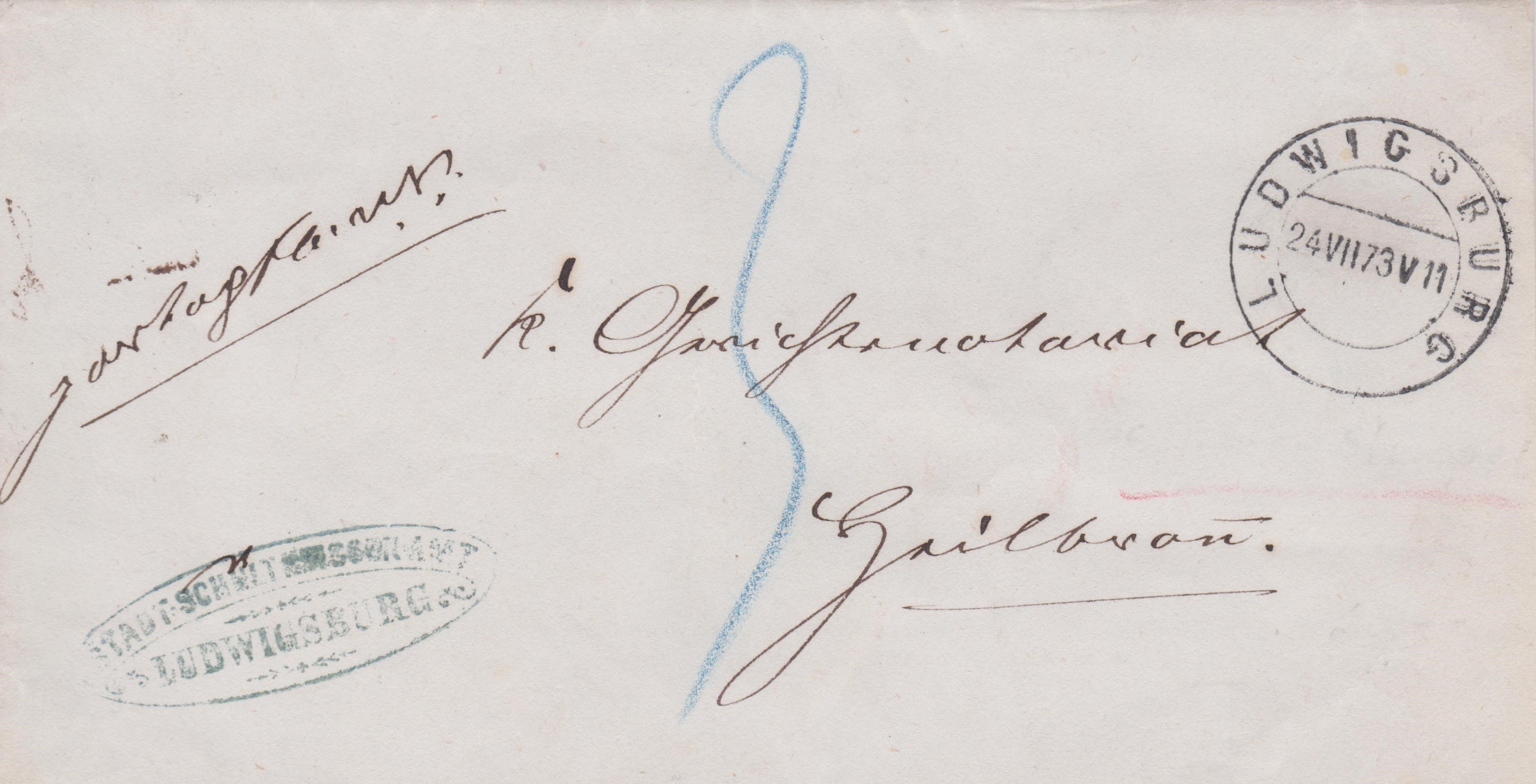 Dieser nach Heilbronn adressierte Beleg wurde "portopflichtig" am 24.08.1873 in LUDWIGSBURG aufgegeben: