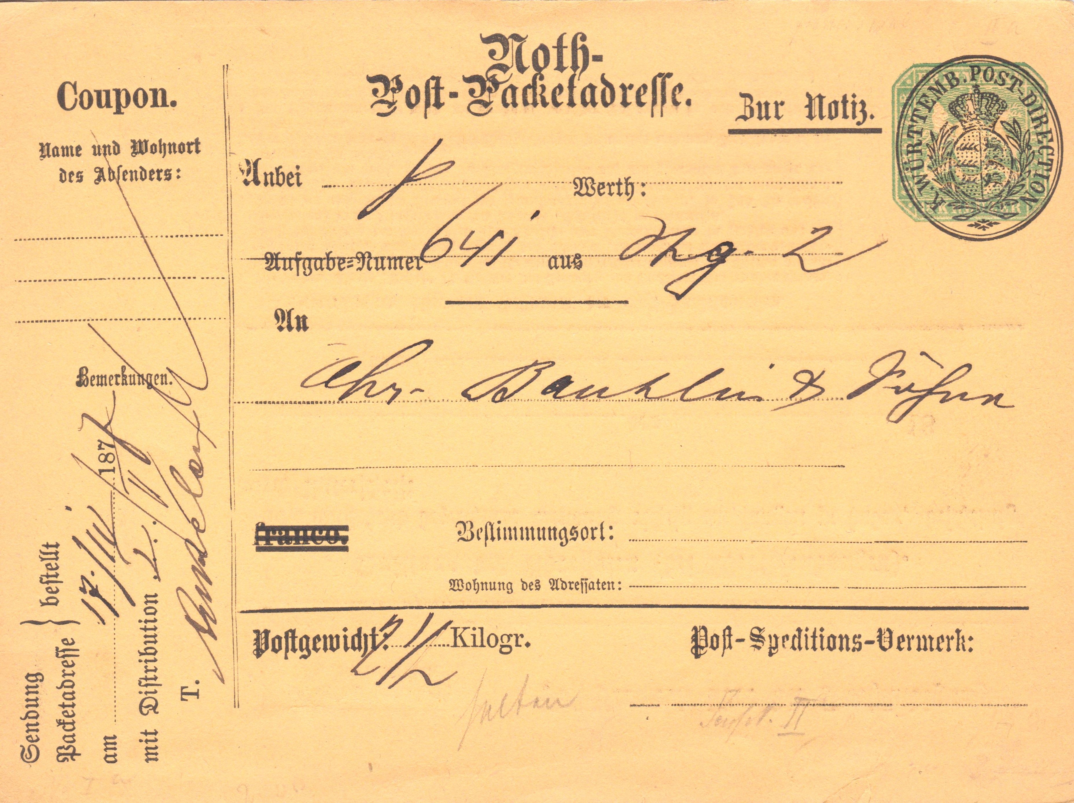 Foren-Übersicht Fragen und Diskussion Deutschland Deutschland bis 1945 Altdeutschland Württemberg Württemberg - Markenzeit Ganzsache "Noth-Post-Packetadresse" 1877