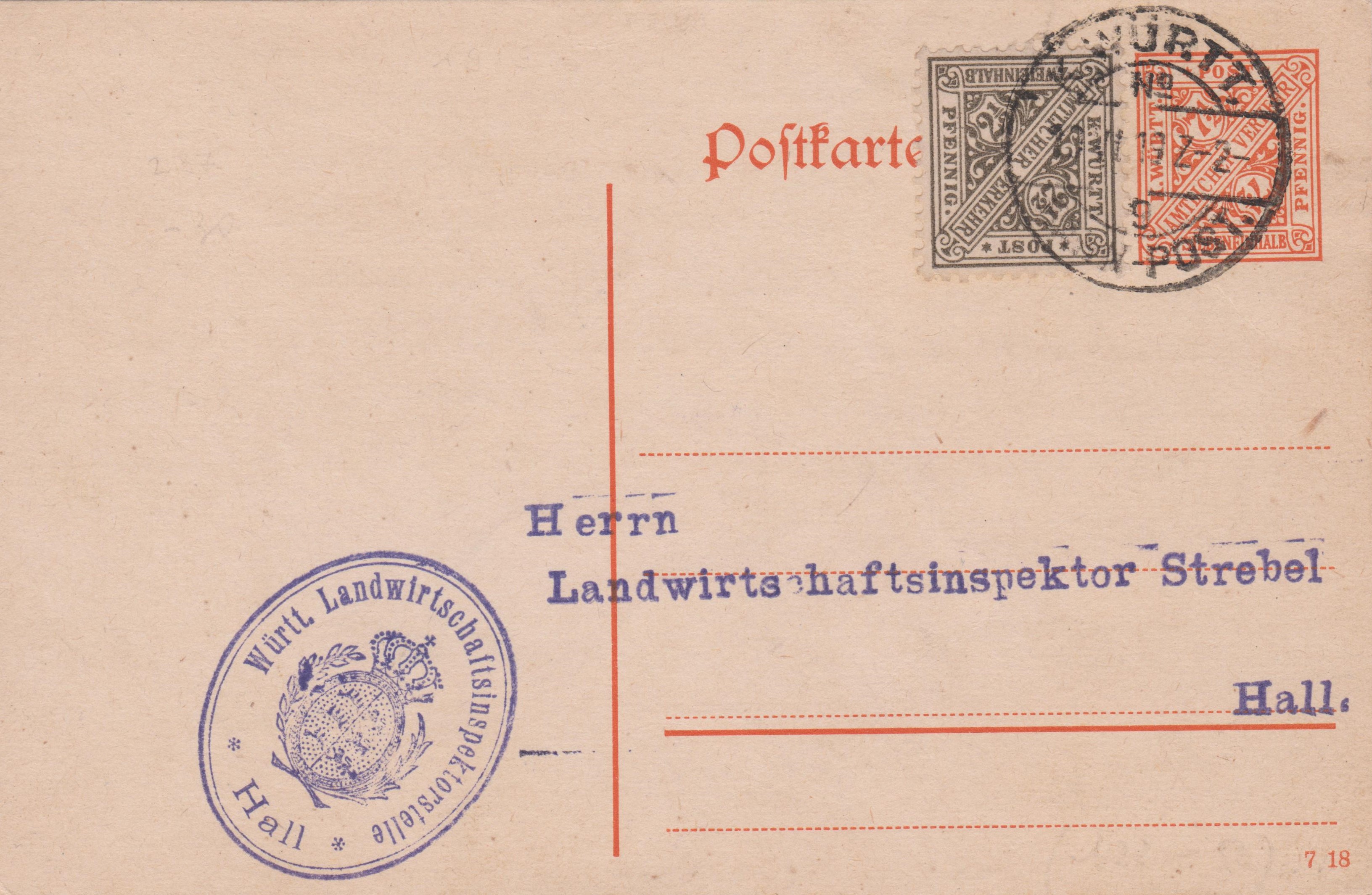 Diese Ganzsache mit eingedrucktem Postwertzeichen zu 7 1/2 Pf wurde 1919 adressiert nach Hall mit einer Zusatzfrankatur von 2 1/2 Pf versehen bei der württembergischen Bahnpost aufgegeben: