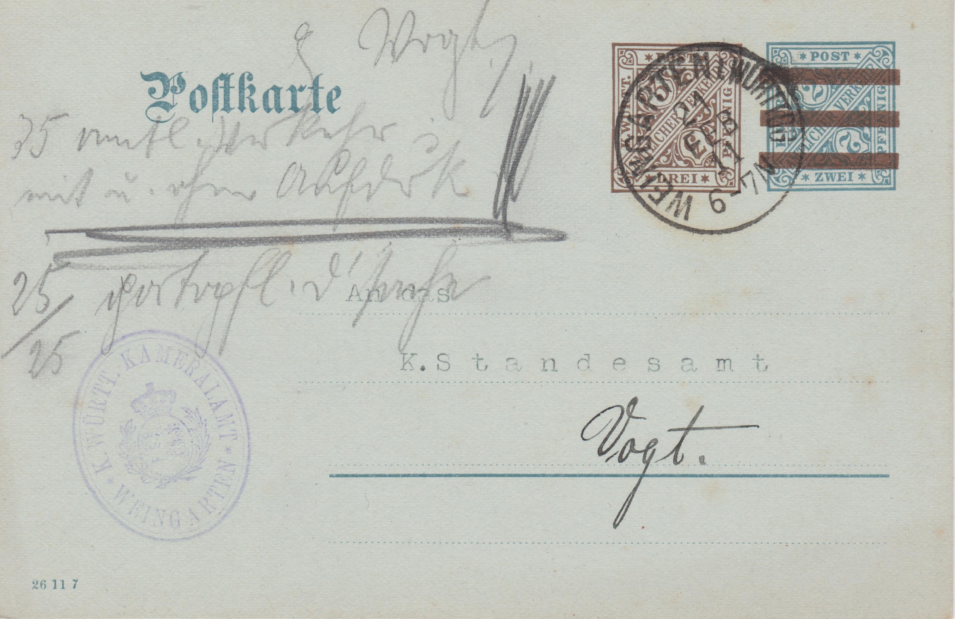 Diese Ganzsache mit Wertzeicheneindruck von 3 Pf neben einem waagerecht durchbalkten Wertzeicheneindruck von 2 Pf wurde am 21.02.1911 in WEINGARTEN aufgegeben: