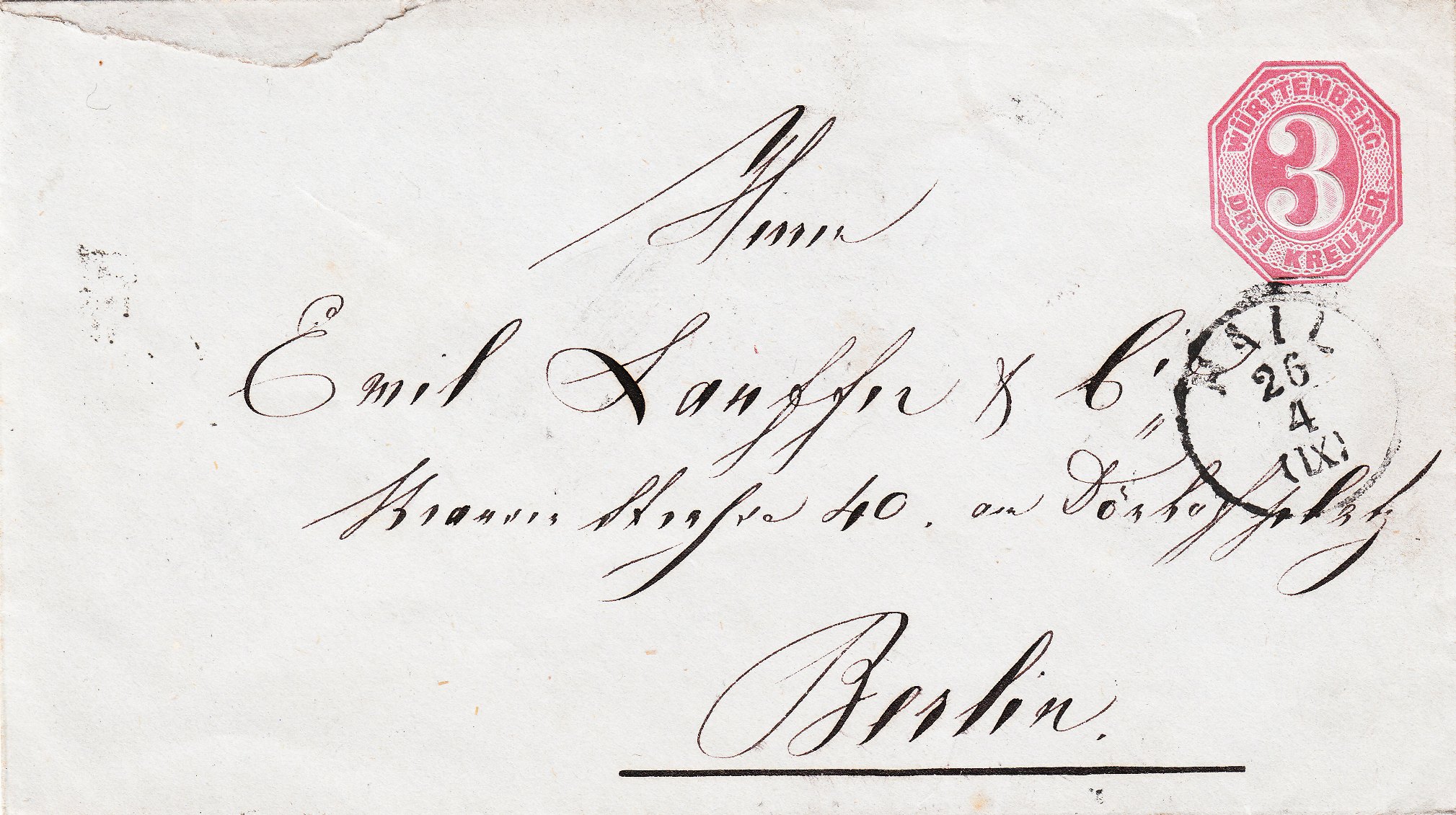 Diese im August 1874 ausgegebene Ganzsache Württemberg U 22 ohne Überdruck mit Klappenstempel K 5 (Wappen) wurde am 26.04.1875 ab "HALL" nach Berlin gebraucht: