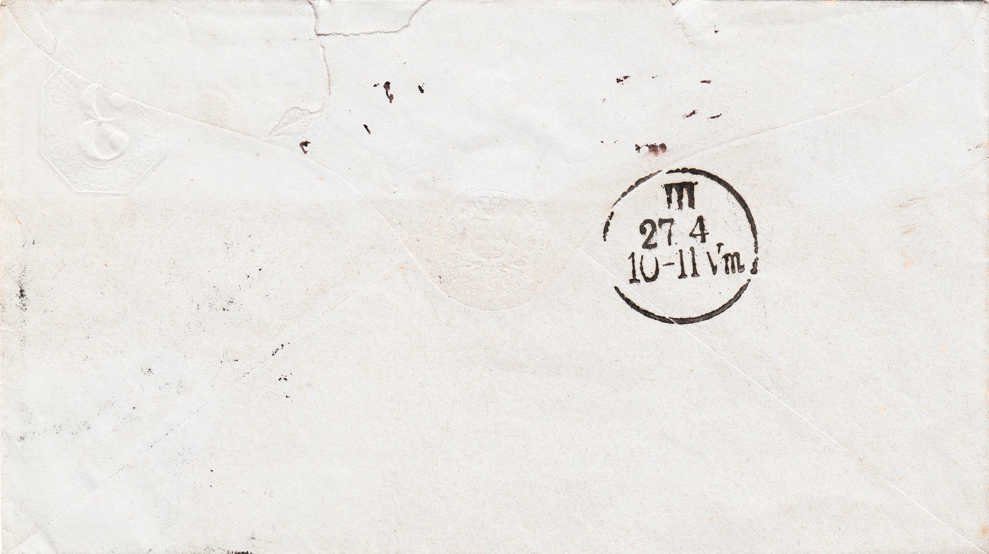 Der Beleg kam laut rückseitigem Ankunftsstempel am 27.04.1875 um "10-11 Vm" in Berlin an.