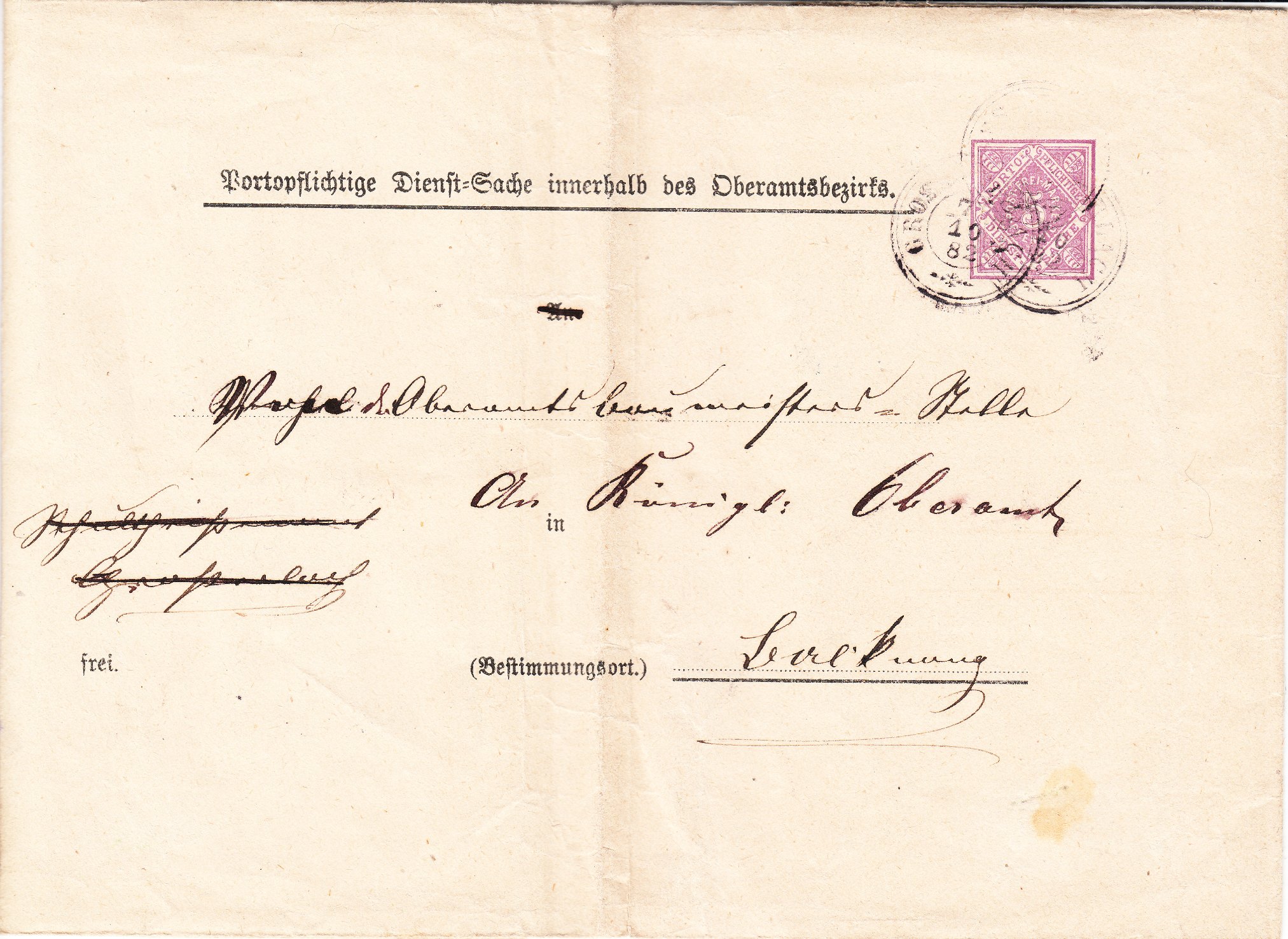 Hier eine Ganzsache mit Eindruck der Sendungsart "Portopflichtige Dienst-Sache innerhalb des Oberamtsbezirks", aufgegeben am 07.10.1882 in Grosserlach im Oberamt Backnang, gelaufen nach BACKNANG, wo sie laut rückseitig abgeschlagenem Tagesstempel am 08.10.1882 ankam: