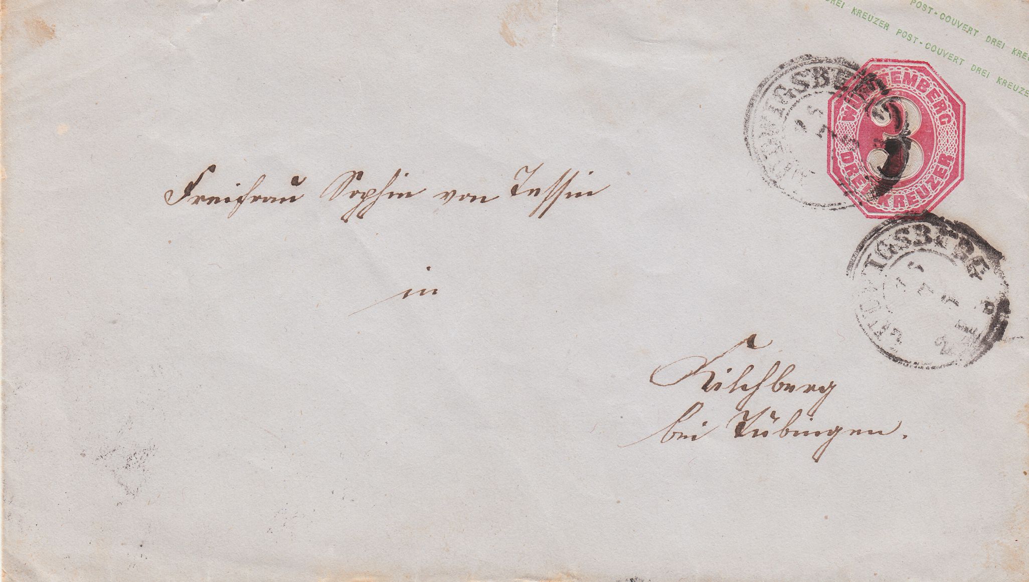 - ein Stempel "K.WÜRTT.FAHREND. POSTAMT. 16 7 19" = Bahnpost