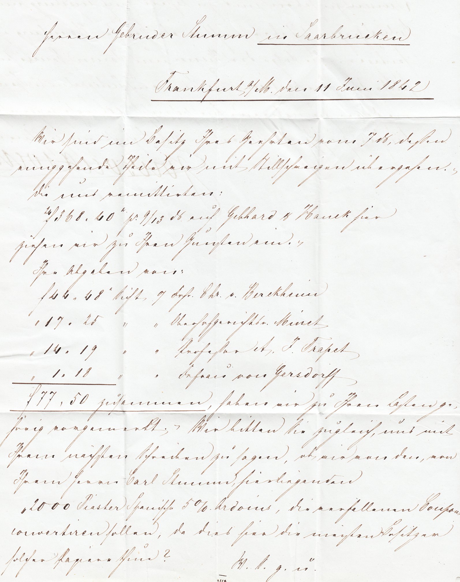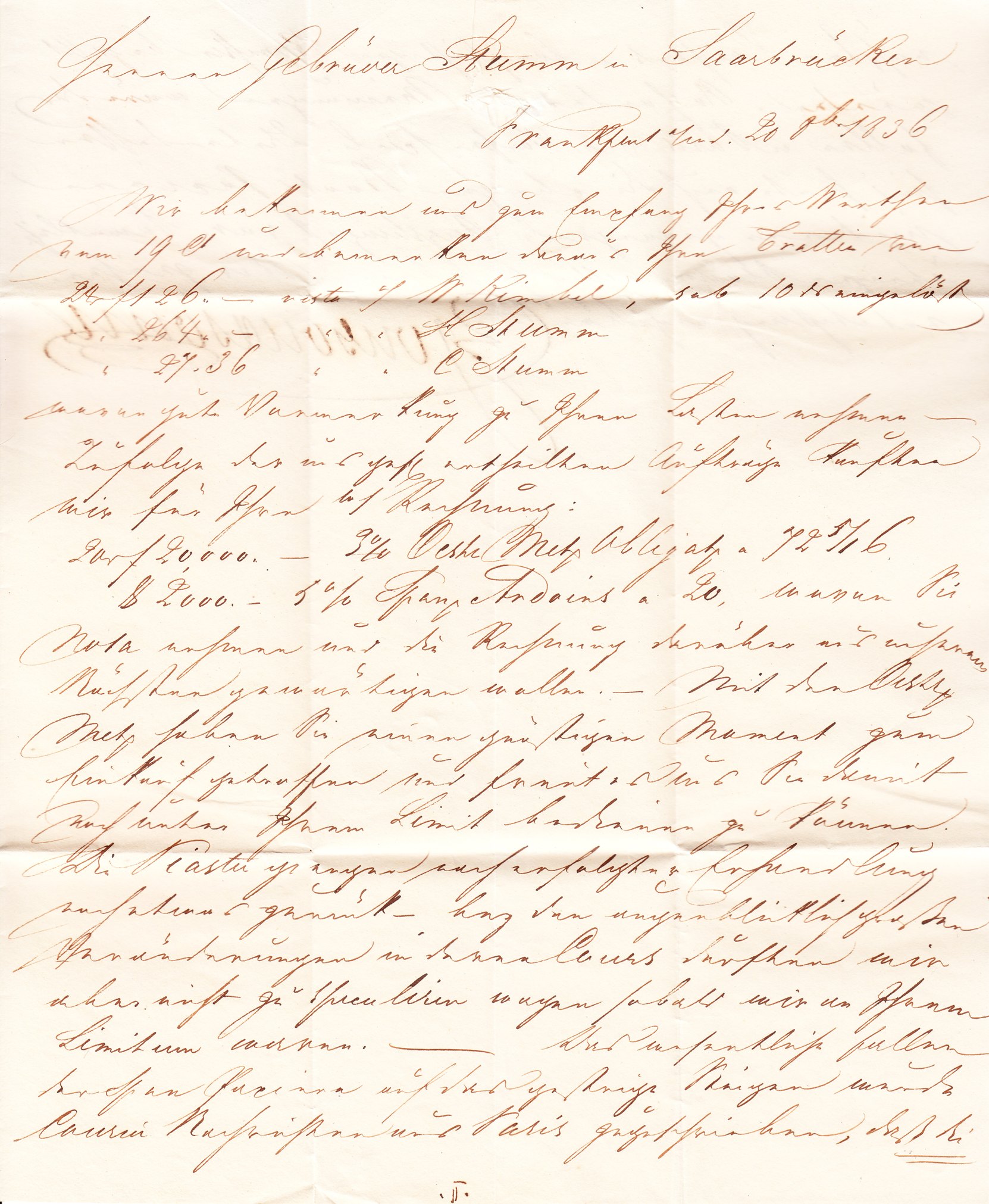 Dieser an "Herren Gebr Stumm" in Saarbrücken adressierte Brief wurde am 20.10.1836 in Frankfurt aufgegeben: