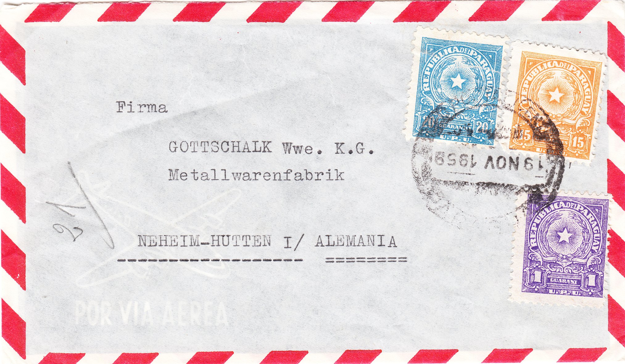 Dieses Motiv zeigen auch die drei einfarbig gedruckten Postwertzeichen aus Paraguay auf diesem Beleg: