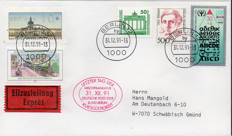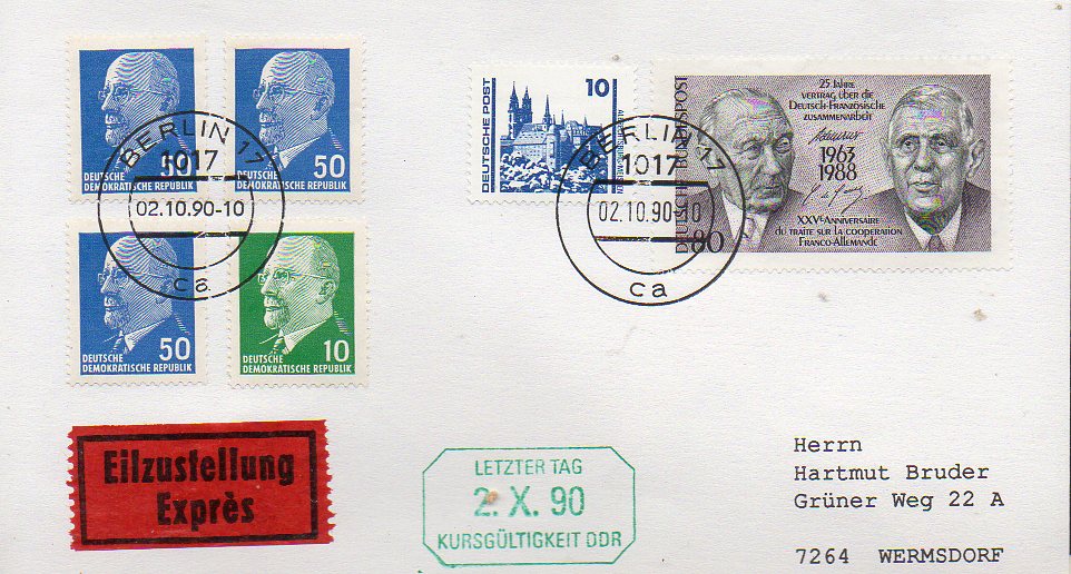 :P Hier möchte ich mich anschliessen und verschenke zu den im Eingangsbeitrag von Heinz genannten Bedingungen die gezeigten Belege zur "Deutschen Einheit". Die Belege (die Eilbriefe sind echt gelaufen und tragen rückseitig einen Ankunftstempel) werden bis zum 20. Dezember 2014 reserviert!