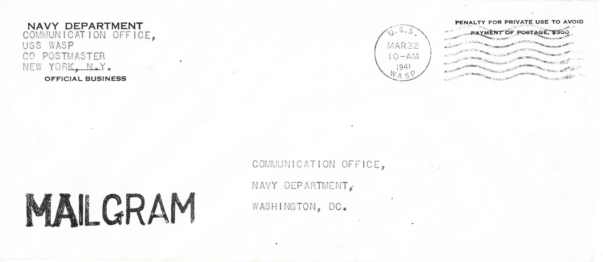 Dieser Dienstbrief "NAVY DEPARTMENT OFFICIAL BUSINESS" wurde als "MAILGRAM" am 22.03.1941 an Bord der USS WASP (CV-7) aufgegeben: