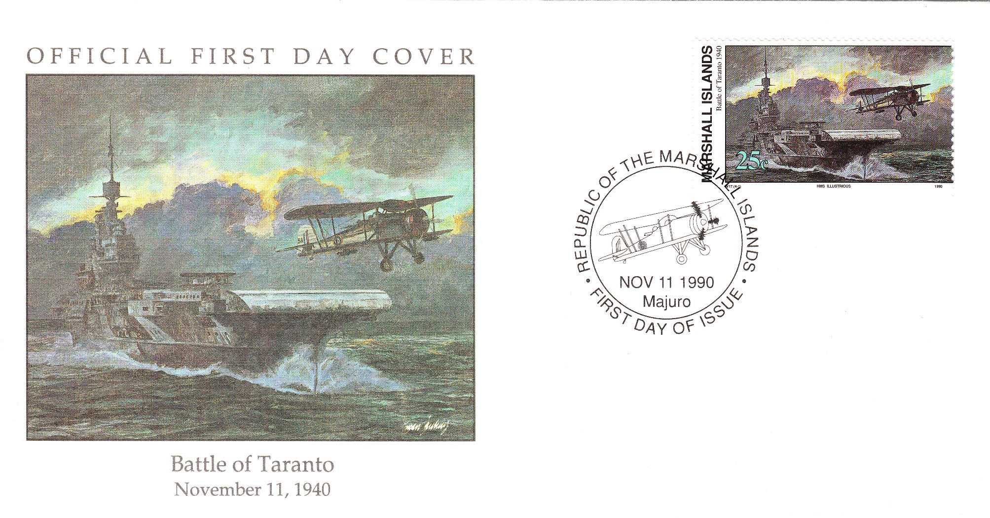 Dieser FDC der Marshall Islands zeigt den Start einer FAIREY SWORDFISH vom Flugzeugträger HMS ILLUSTRIOUS im Rahmen des Angriffs auf Tarent: