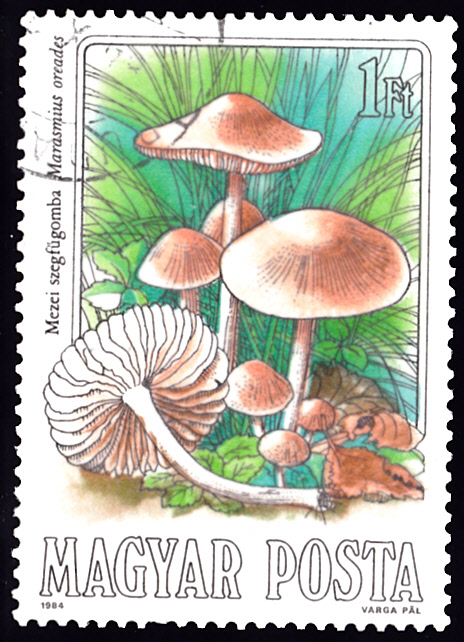 Auf dieser Marke aus Ungarn (MiNr 3708 A) sind Feld- oder Nelkenschwindlinge (Marasmius oreades) abgebildet.