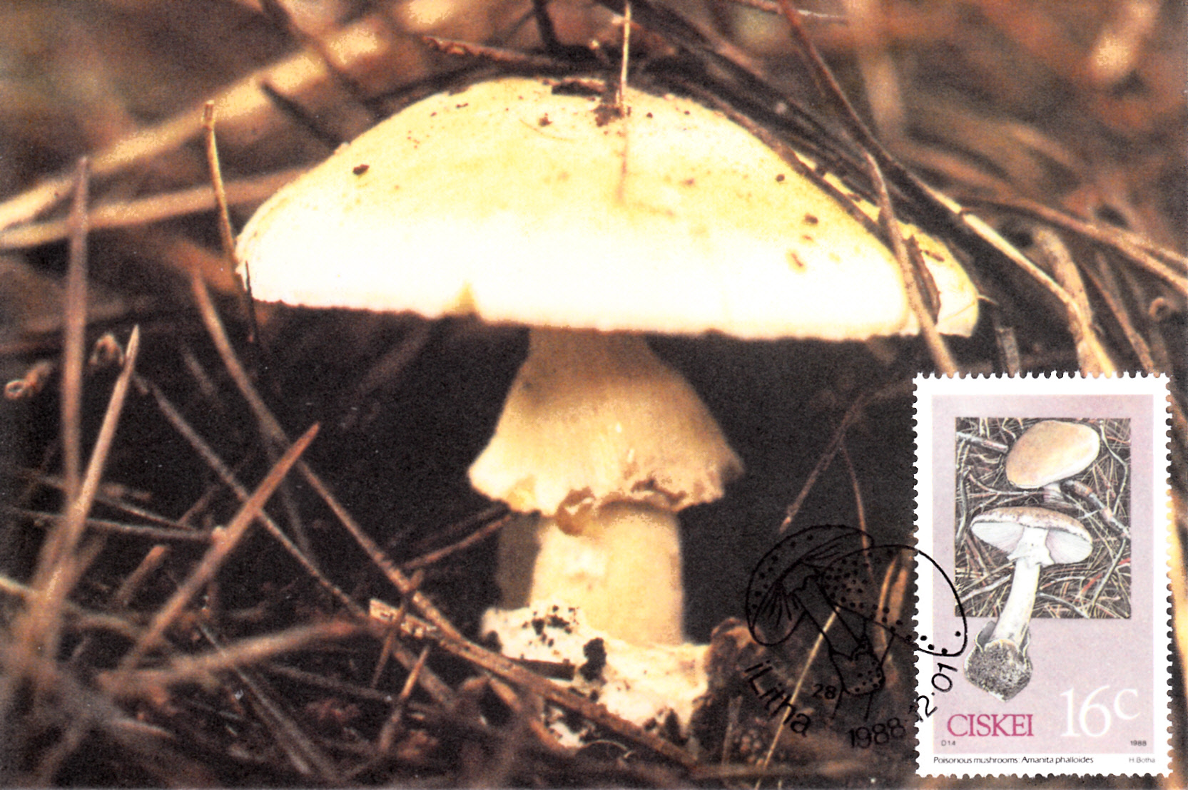 Auf dieser Marke der DDR wird ein Grüner Knollenblätterpilz (Amanita phalloides) gezeigt.