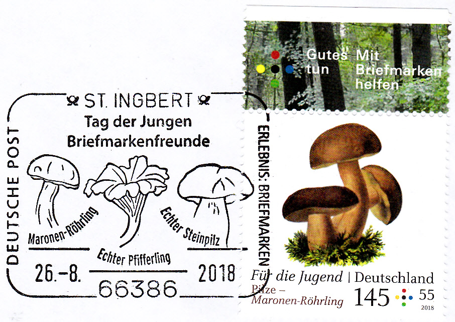 In der Serie "Für die Jugend" 2018 erschien auch eine Marke (MiNr 3409) mit dem Maronen-Röhrling (Imleria badia). Hier ein Eckrandstück mit EAN-Code: