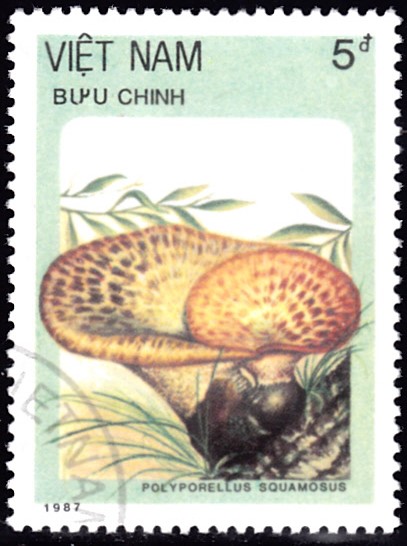 Auf einer Marke aus Vietnam (MiNr 1876) wird ein Schuppige Stielporling (Cerioporus squamosus) gezeigt.