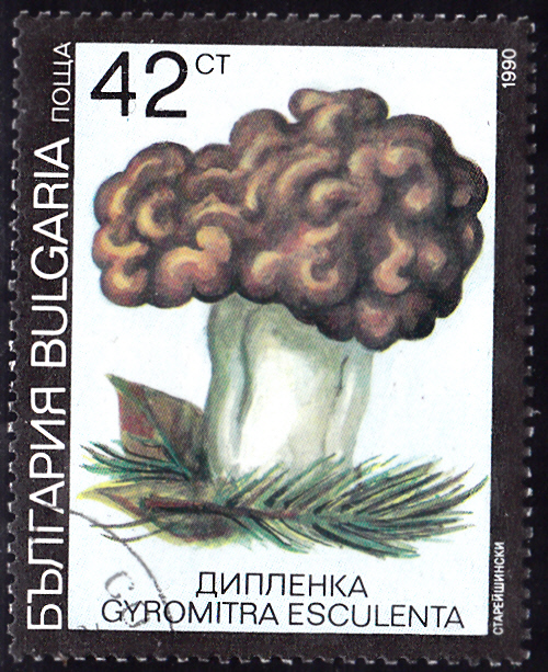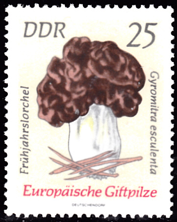 Eine Marke aus der DDR (MiNr 1937) zeigt eine Frühjahrs-Giftlorchel (Gyromitra esculenta).