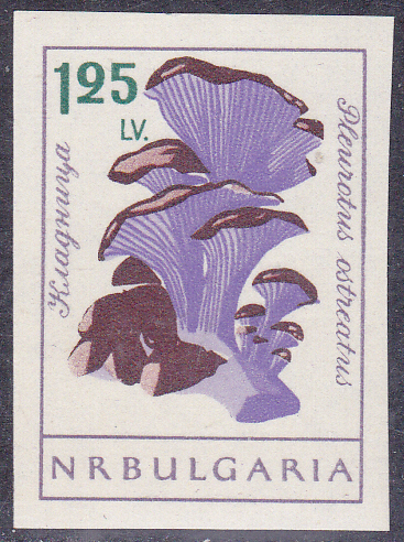 Auf einer geschnittenen Marke aus Bulgarien (MiNr 1277) ist ein Austern-Seitling oder Austernpilz (Pleurotus ostreatus) abgebildet.