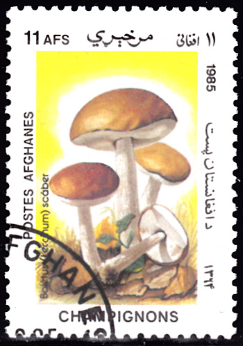 Auf dieser Marke aus Afghanistan (MiNr 1414) können wir Gemeine Birkenpilze (Leccinum scabrum) sehen.