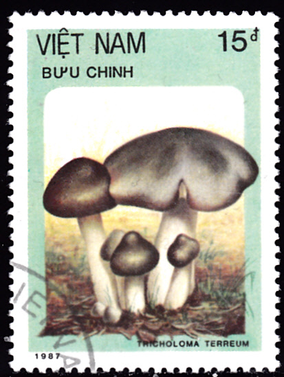 Diese Marke aus Guinea-Bissau (MiNr 4299) zeigt auf der linken Seite der Marke Gelbliche oder Grüngelbe Ritterlinge (Tricholoma sejunctum)