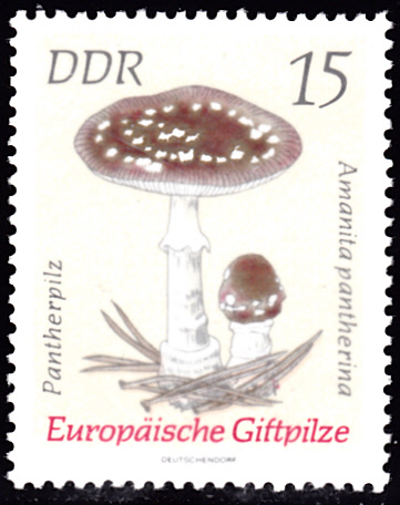 Auf dieser Marke der DDR (MiNr 1935) ist ein Pantherpilz (Amanita pantherina) zu sehen.