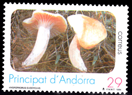 Auf dieser Marke der Spanischen Post in Andorra (MiNr 239) sind zwei Schleimigberingte Schnecklinge (Hygrophorus gliocylus) abgebildet.