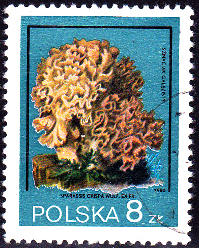 Eine Marke aus Polen (MiNr 2697) bildet eine Krause Glucke (Sparassis crispa) ab.