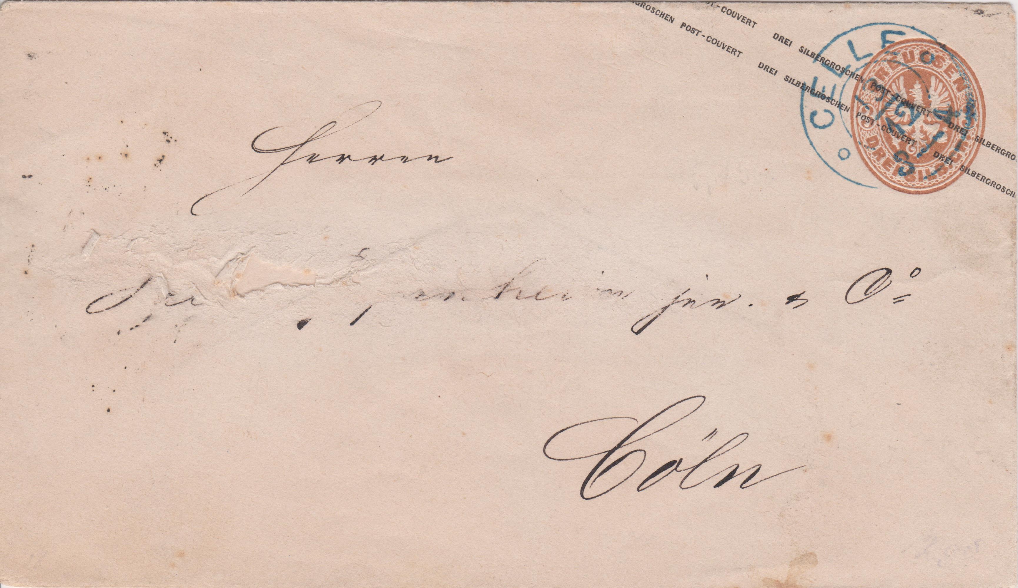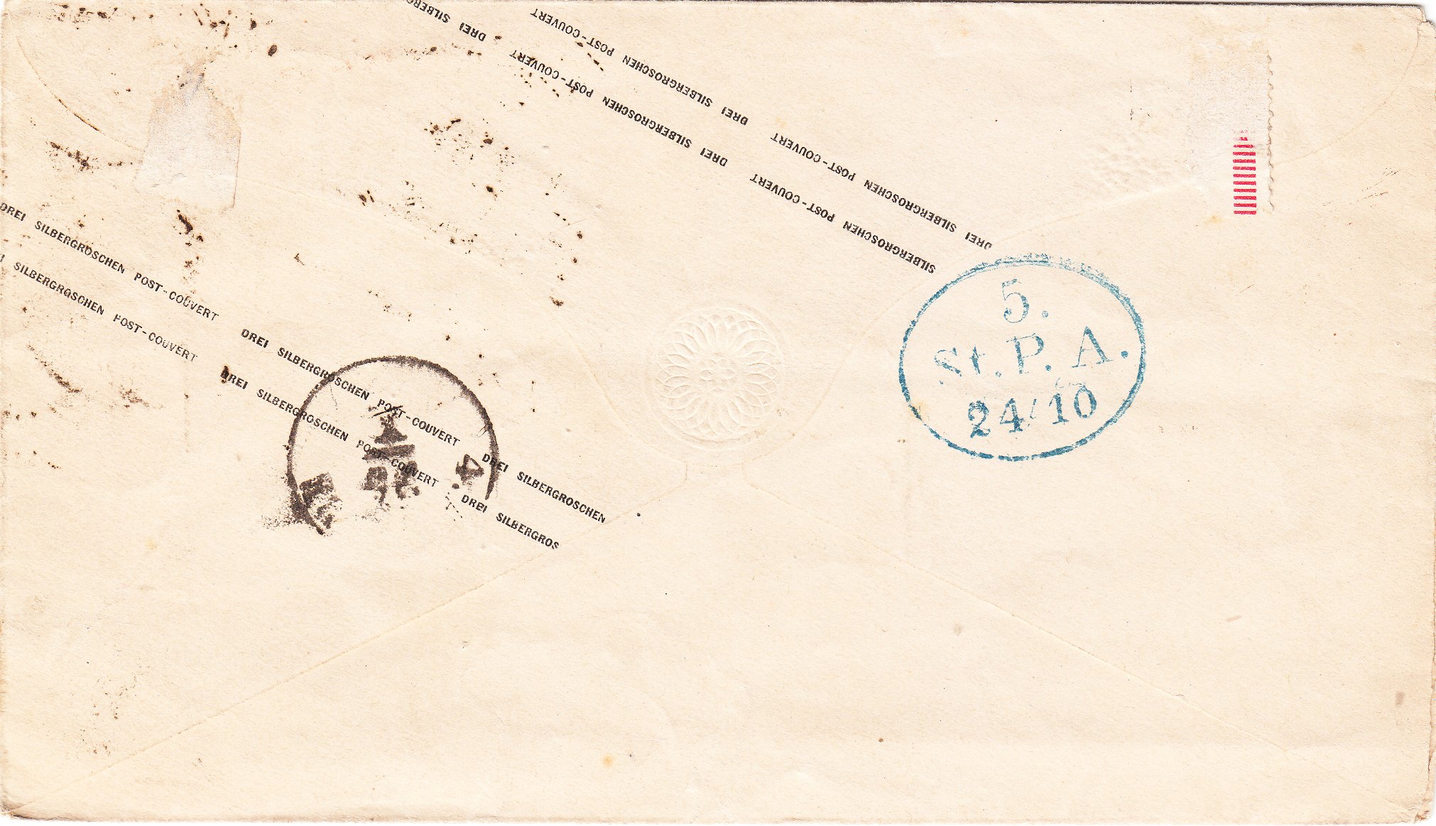 Dieses Exemplar wurde relativ spät verwendet und erst zur Zeit des Norddeutschen Bundes am 24.10.1867 in Hamburg in einen Briefkasten eingeworfen.