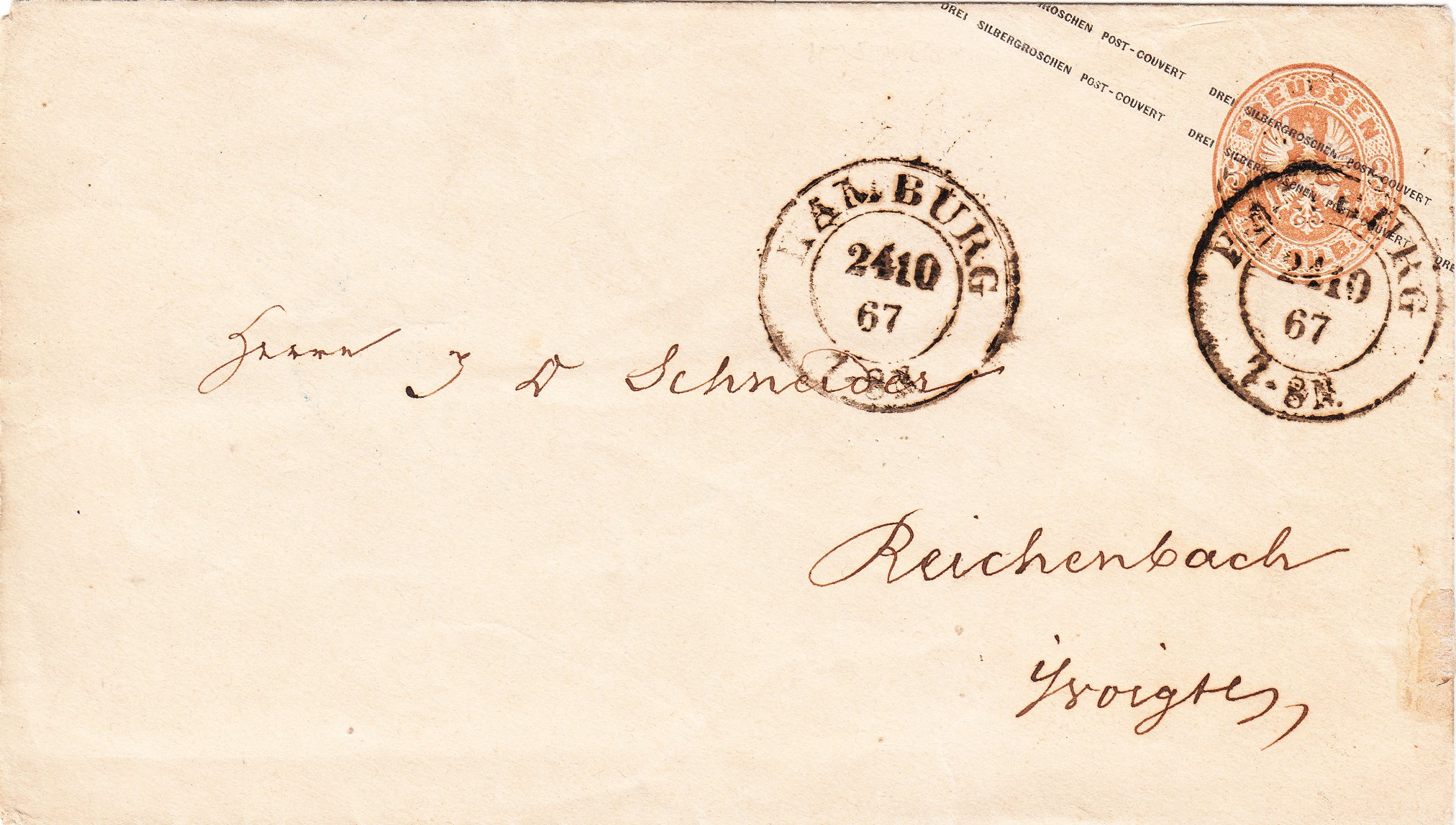Dieses Exemplar wurde relativ spät verwendet und erst zur Zeit des Norddeutschen Bundes am 24.10.1867 in Hamburg in einen Briefkasten eingeworfen.