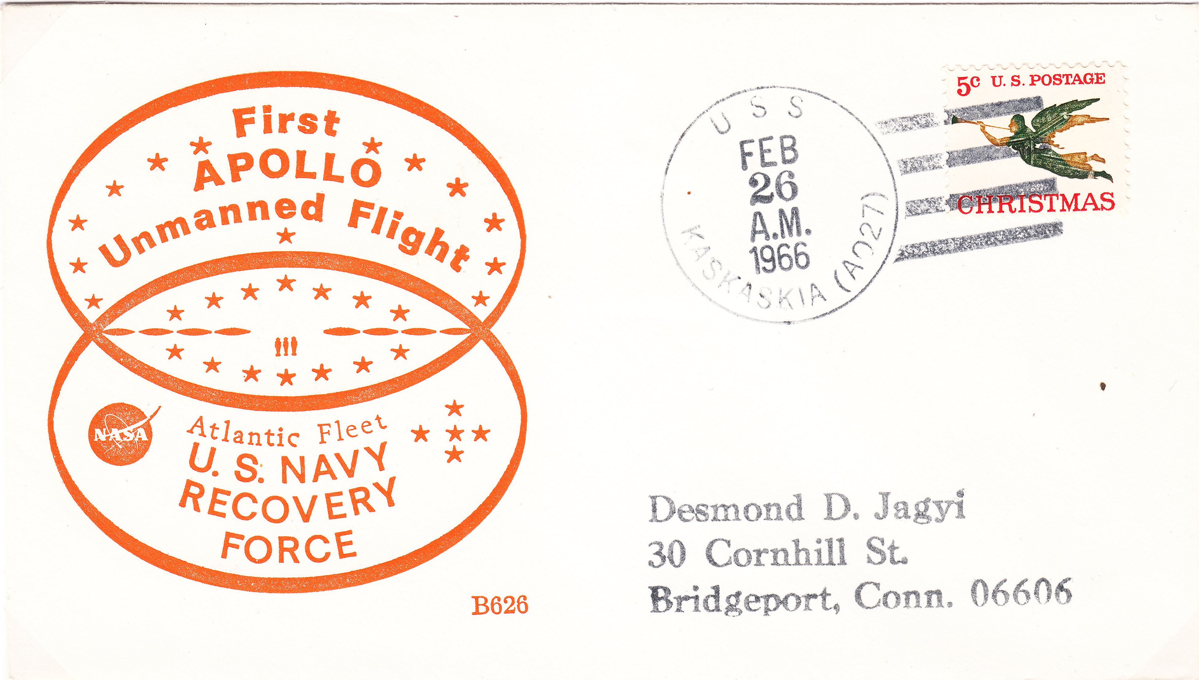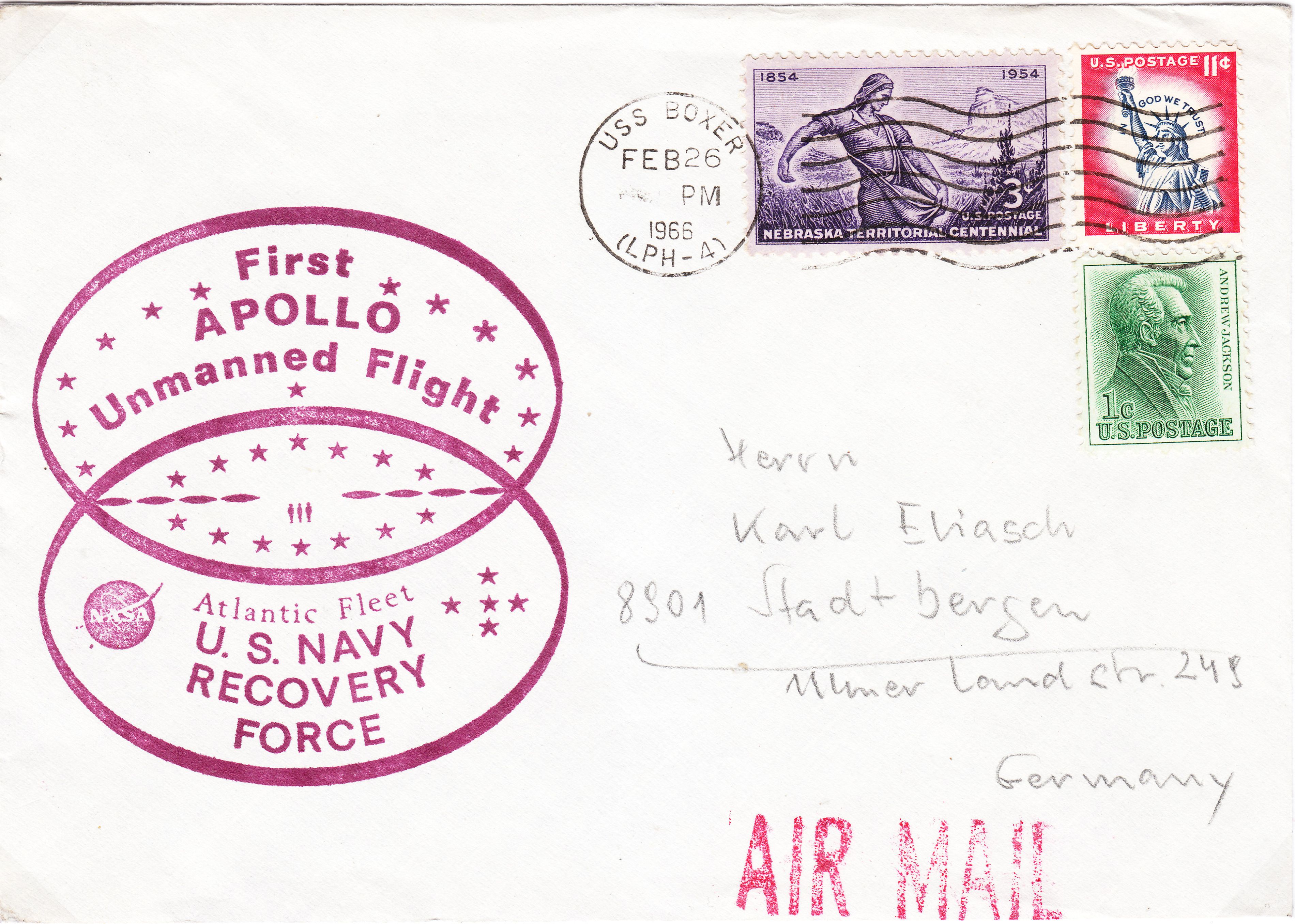 Der hier gezeigte Brief dokumentiert diese erste APOLLO-Mission mit einem Cachetstempel der Bergungsflotte im Atlantik: