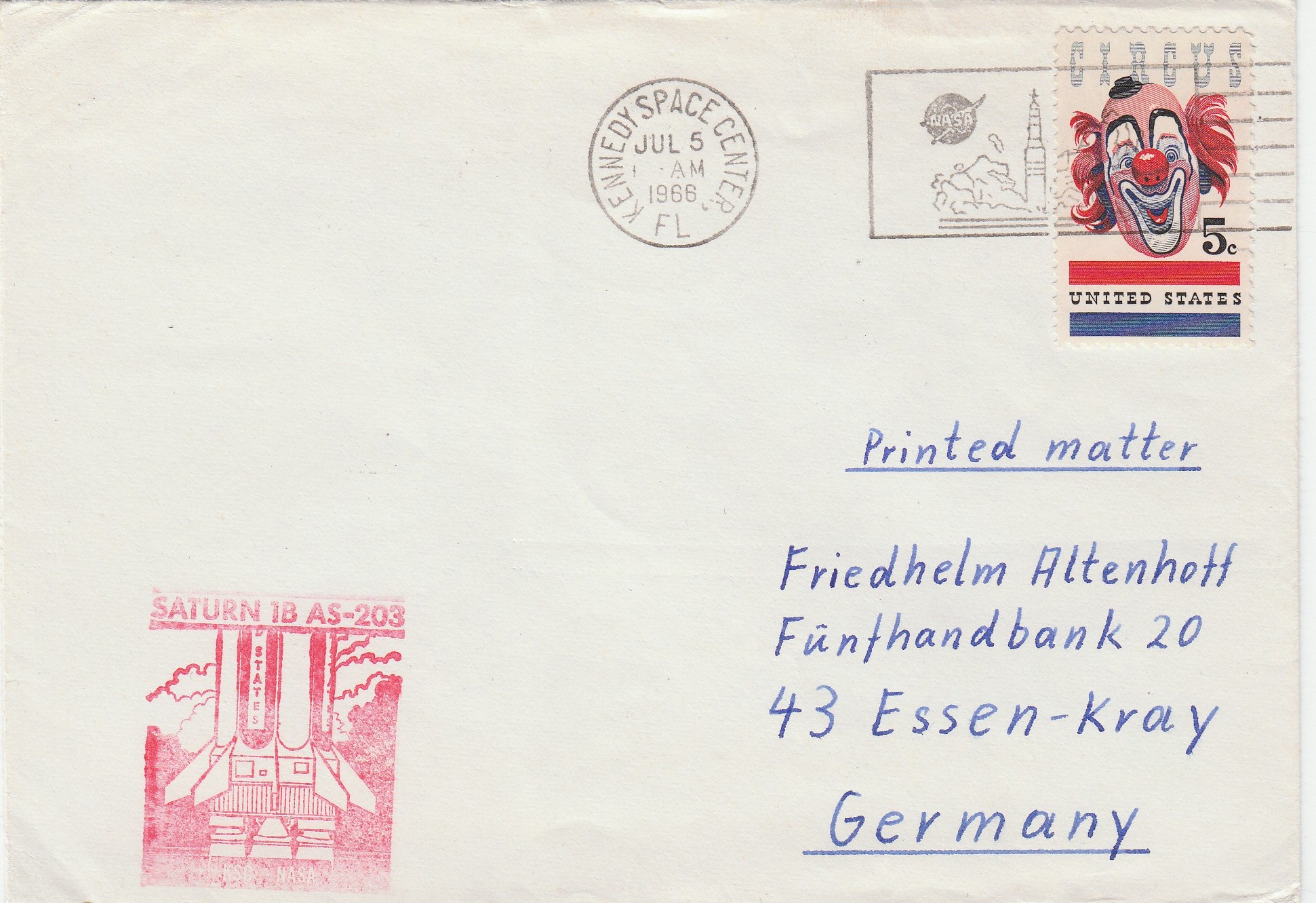 Hier ein als Drucksache nach Deutschland gelaufener Beleg mit einem Cachetstempel in Rot "SATURN IB AS-203" und einem Stempel vom "KENNEDY SPACE CENTER" vom 05.07.1966: