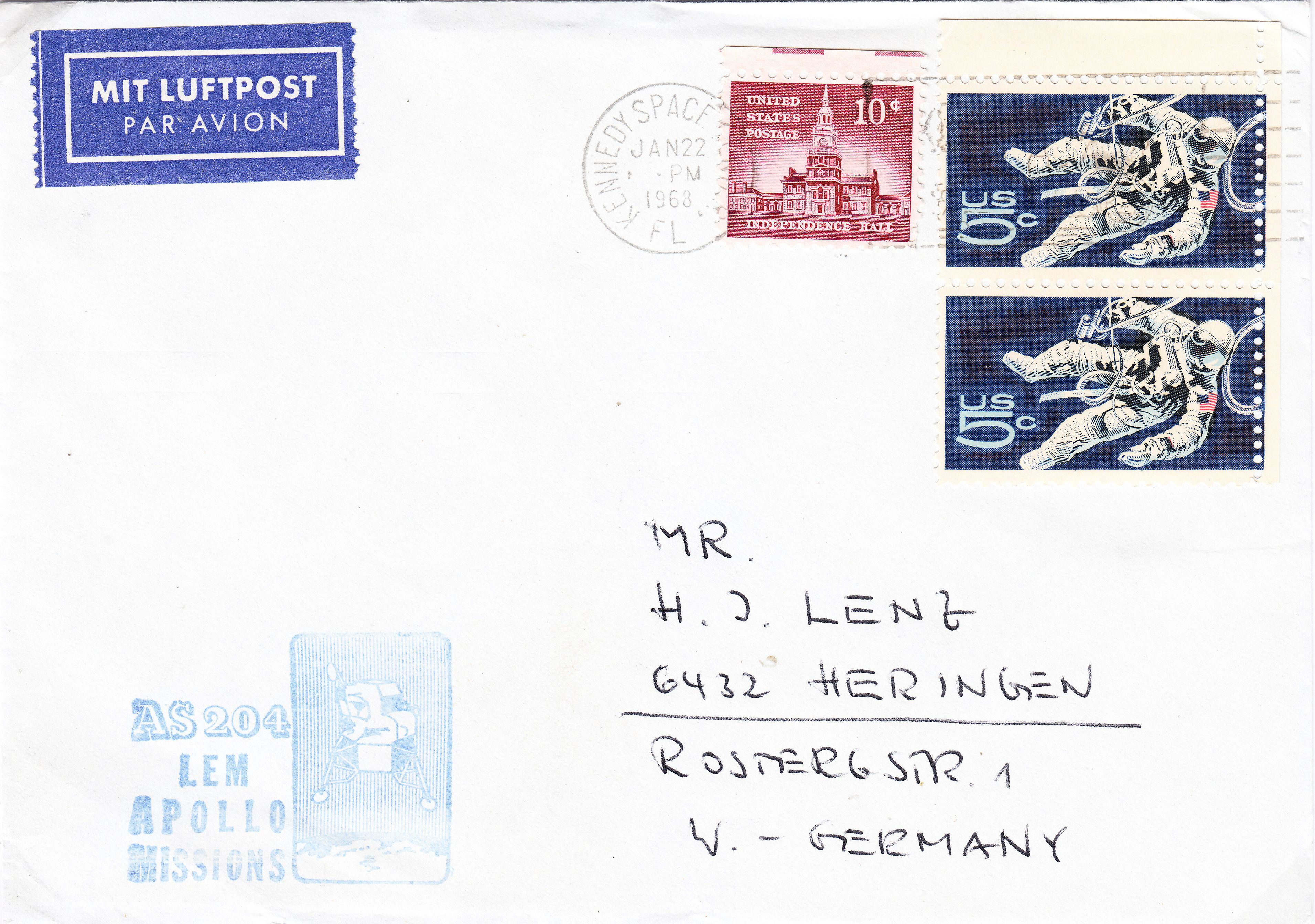 Dieser am 22.01.1968 im KENNEDY SPACE CENTER abgestempelte Beleg trägt den selten zu findenden blauen Cachetstempel dieser Mission: