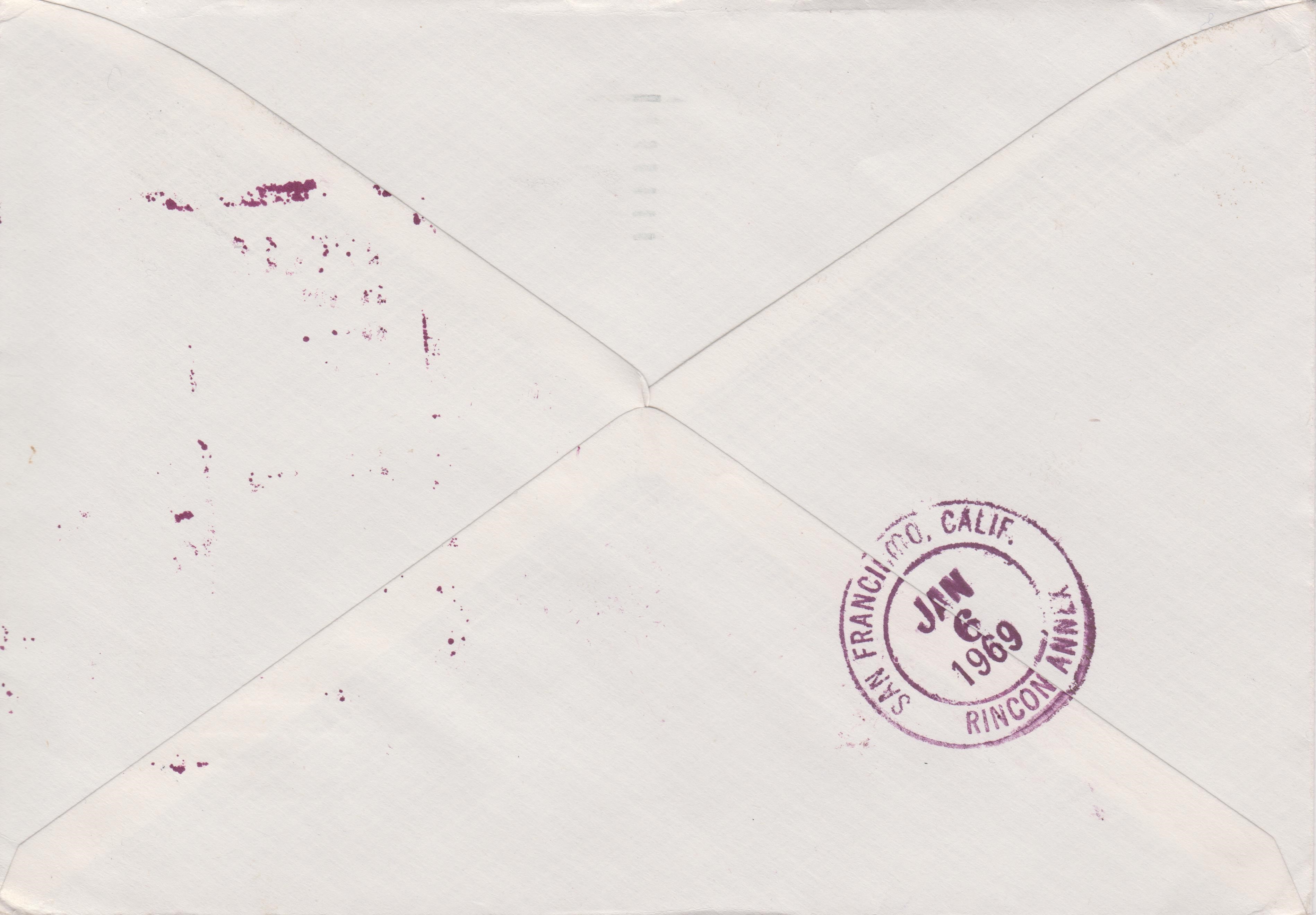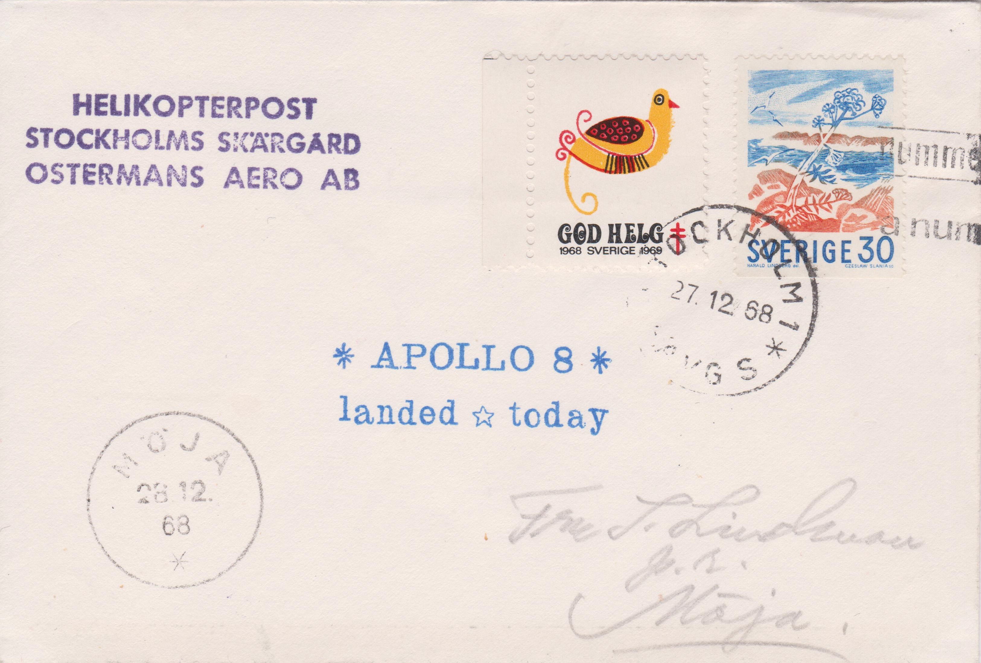 Dieser Beleg mit Stempeldatum 21.12.1968 dokumentiert den Verlauf der APOLLO 8-Mission vom Start am 21.12.1968 bis zur Landung am 27.12.1968: